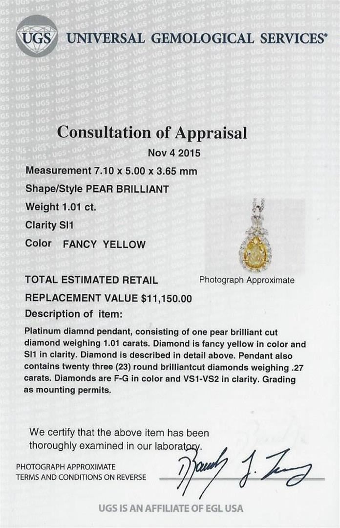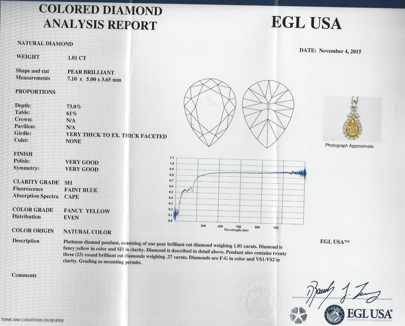 One pendant with chain featuring: platinum consisting of one pear brilliant cut diamond measuring 7.10 x 5.00 x 3.65mm weighing 1.01ct. Diamond is fancy yellow in color and SI1 in clarity. Pendant also contains twenty three (23) round brilliant cut diamonds weighing 0.27ct. Diamonds are F-G in color and VS1-VS2 in clarity. Grading as mounting permits. EGL USA Appraised.