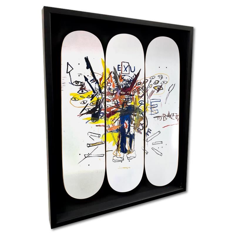 "EXU, 1988" is a skateboard triptych by Jean-Michel Basquiat (1960-1988), bearing the plate signature of the artist inverso. This triptych comes custom framed. Includes Letter of Authenticity. Measures approx. 30" x 37" x 30" x 3" (frame), 32" x 24" (skateboards).