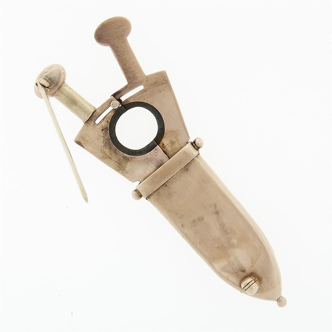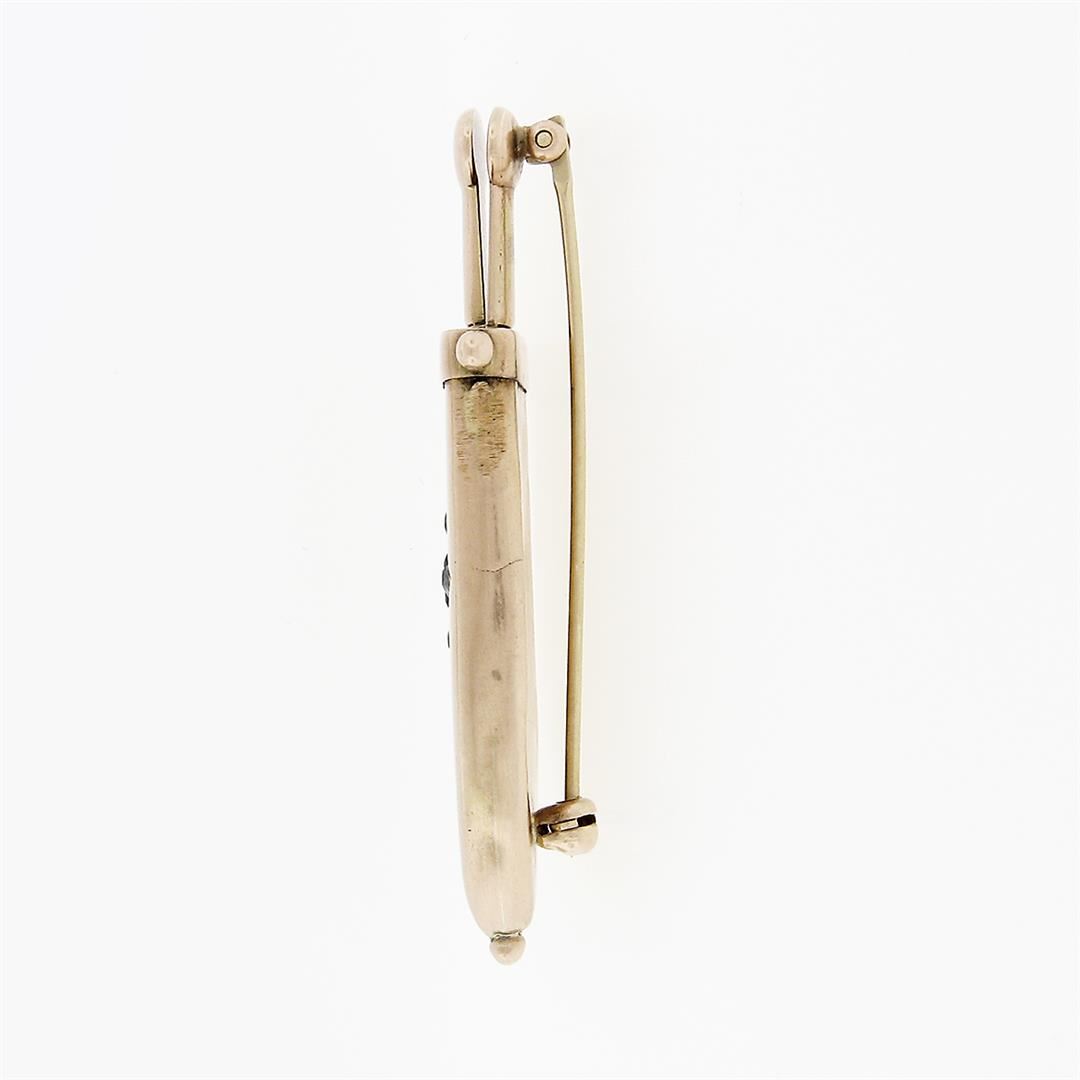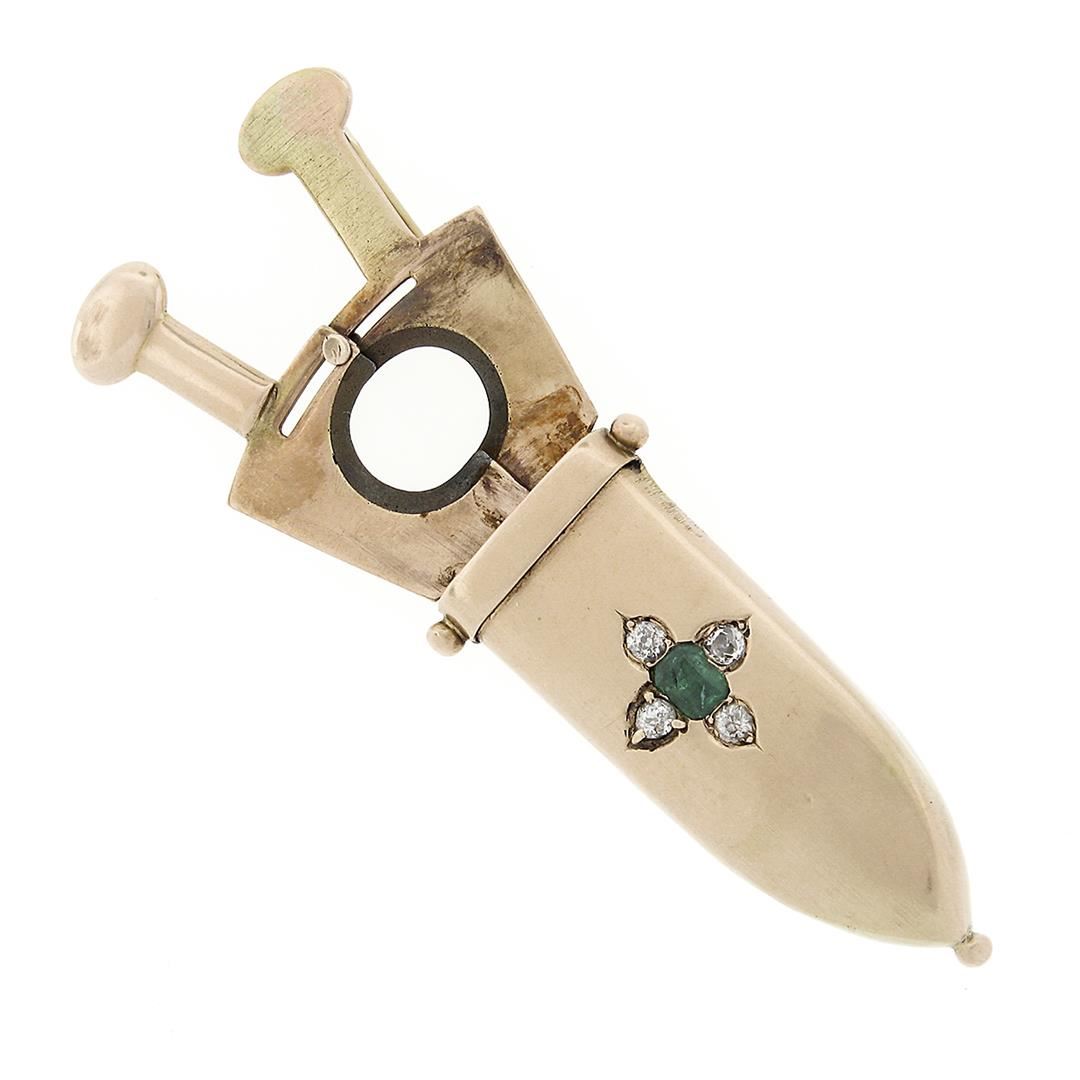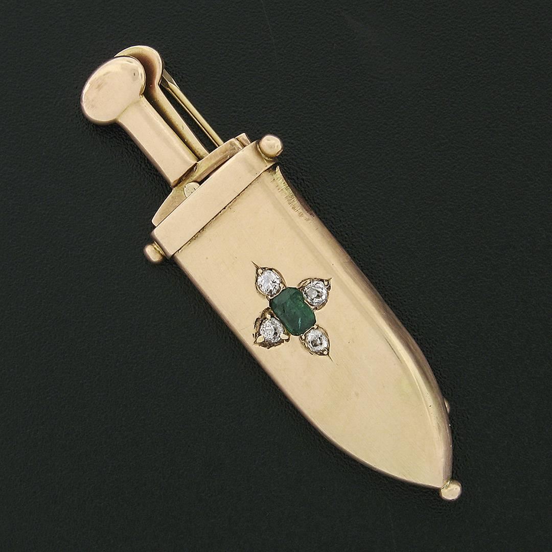 An antique solid 14k yellow gold cigar cutter pin brooch, with 1 emerald cut natural emerald (0.25ct), & 4 old mine cut natural diamonds (H/I- VS2; 0.28ctw). Measures 50.65x18.42mm and weighs a total of 14.02 grams.