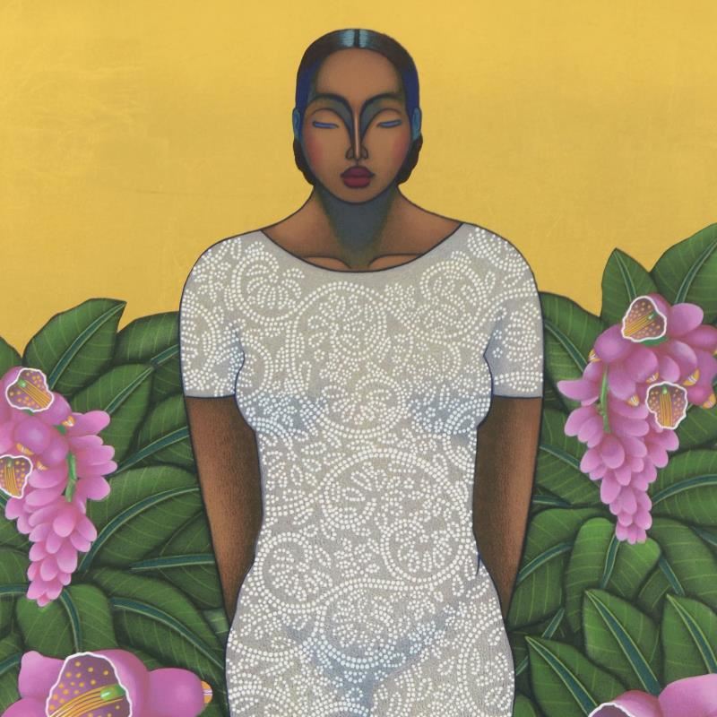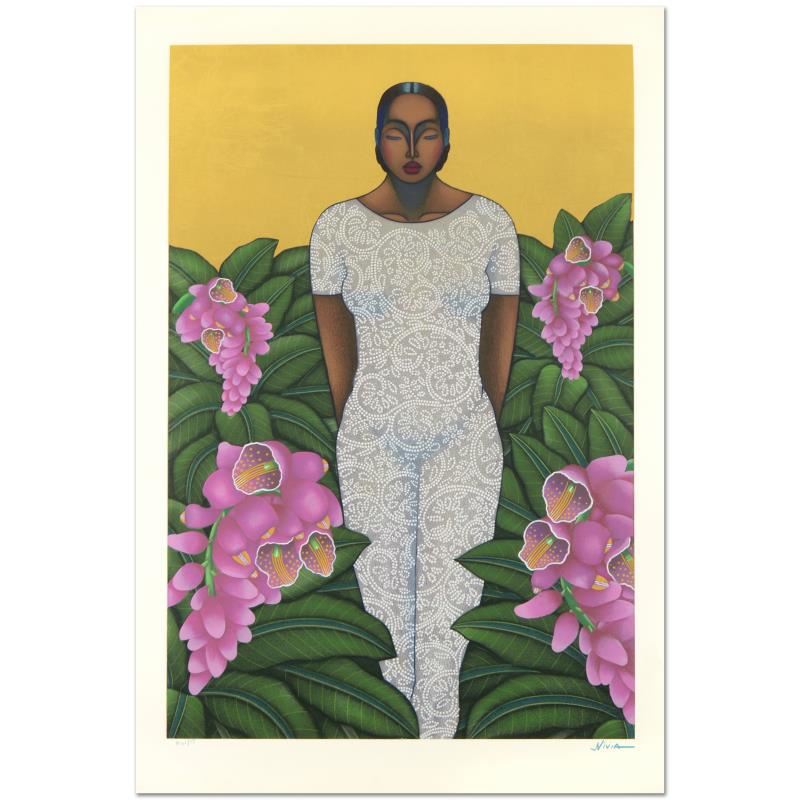 "Echoes Of Edens Lost" is a limited edition serigraph on paper with gold leaf by Nivia Gonzales (1946-2017), numbered and hand signed by the artist. Includes Certificate of Authenticity. Measures approx. 28" x 41" (border), 24" x 36" (image).