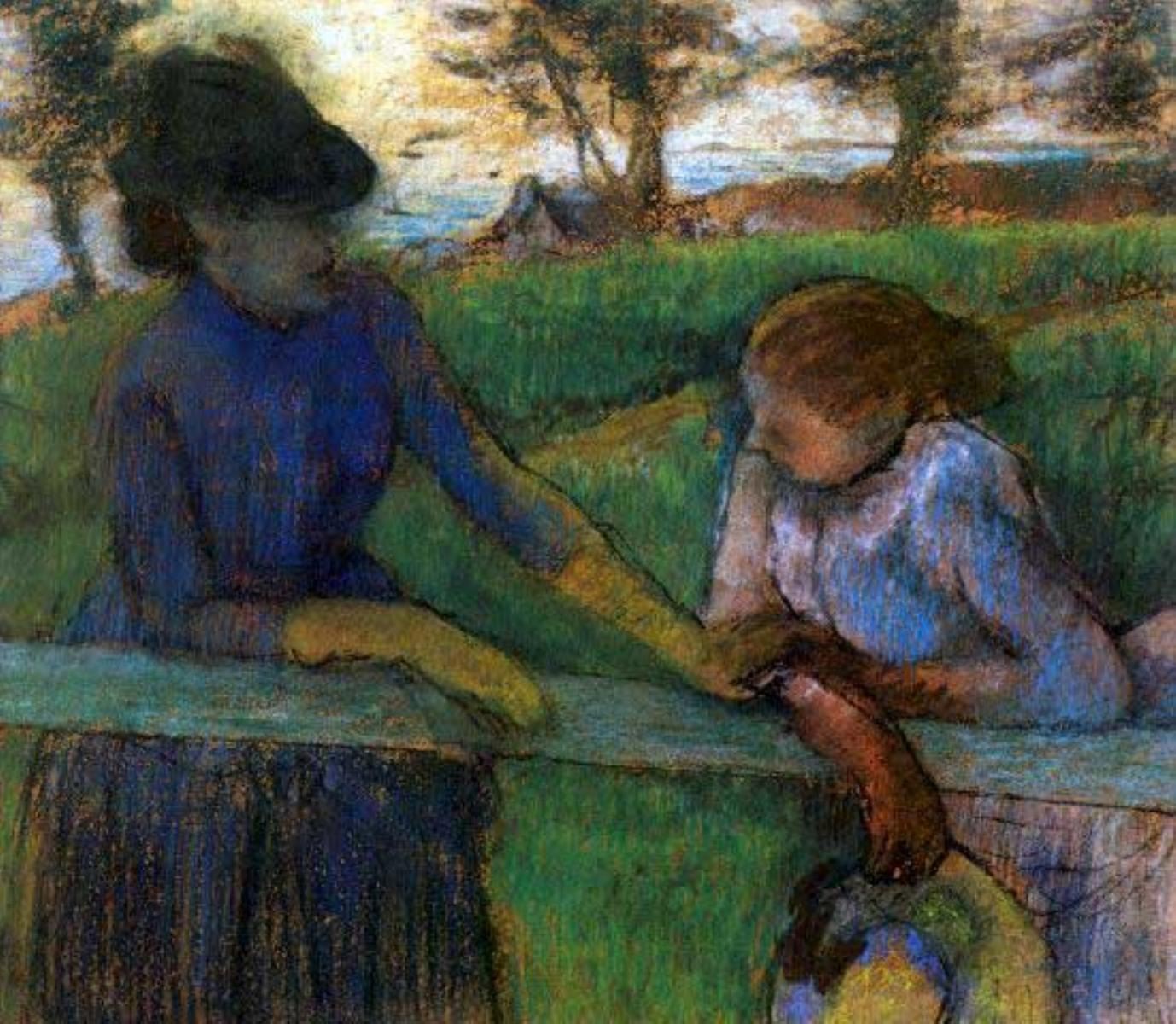 Artist: Degas - Title: Conversation - Medium: Fine Art Reproduction Giclee on Archival Canvas - Image Size: Approximately 17.5 inches x 20 inches - Framed: Unframed on Unstretched Canvas - Edgar Degas was a French artist famous for his work in painting, sculpture, printmaking and drawing. He is regarded as one of the founders of Impressionism although he rejected the term, and preferred to be called a realist. A superb draftsman, he is especially identified with the subject of the dance, and over half of his works depict dancers. These display his mastery in the depiction of movement, as do his racecourse subjects and female nudes. His portraits are notable for their psychological complexity and depiction of human isolation. - Early in his career, he wanted to be a history painter, a calling for which he was well prepared by his rigorous academic training and close study of classic art. In his early thirties, he changed course, and by bringing the traditional methods of a history painter to bear on contemporary subject matter, he became a classical painter of modern life.