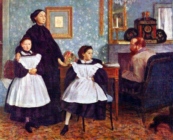 Artist: Degas - Title: Portait Of The Bellelli Family - Medium: Fine Art Reproduction Giclee on Archival Canvas - Image Size: Approximately 16.25 inches x 20 inches - Framed: Unframed on Unstretched Canvas - Edgar Degas was a French artist famous for his work in painting, sculpture, printmaking and drawing. He is regarded as one of the founders of Impressionism although he rejected the term, and preferred to be called a realist. A superb draftsman, he is especially identified with the subject of the dance, and over half of his works depict dancers. These display his mastery in the depiction of movement, as do his racecourse subjects and female nudes. His portraits are notable for their psychological complexity and depiction of human isolation. - Early in his career, he wanted to be a history painter, a calling for which he was well prepared by his rigorous academic training and close study of classic art. In his early thirties, he changed course, and by bringing the traditional methods of a history painter to bear on contemporary subject matter, he became a classical painter of modern life.