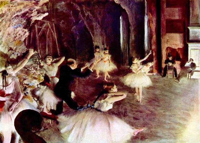 Artist: Degas - Title: Stage Rehearsal - Medium: Fine Art Reproduction Giclee on Archival Canvas - Image Size: Approximately 14.25 inches x 20 inches - Framed: Unframed on Unstretched Canvas - Edgar Degas was a French artist famous for his work in painting, sculpture, printmaking and drawing. He is regarded as one of the founders of Impressionism although he rejected the term, and preferred to be called a realist. A superb draftsman, he is especially identified with the subject of the dance, and over half of his works depict dancers. These display his mastery in the depiction of movement, as do his racecourse subjects and female nudes. His portraits are notable for their psychological complexity and depiction of human isolation. - Early in his career, he wanted to be a history painter, a calling for which he was well prepared by his rigorous academic training and close study of classic art. In his early thirties, he changed course, and by bringing the traditional methods of a history painter to bear on contemporary subject matter, he became a classical painter of modern life.