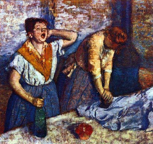 Artist: Degas - Title: Two Cleaning Women - Medium: Fine Art Reproduction Giclee on Archival Canvas - Image Size: Approximately 19 inches x 20 inches - Framed: Unframed on Unstretched Canvas - Edgar Degas was a French artist famous for his work in painting, sculpture, printmaking and drawing. He is regarded as one of the founders of Impressionism although he rejected the term, and preferred to be called a realist. A superb draftsman, he is especially identified with the subject of the dance, and over half of his works depict dancers. These display his mastery in the depiction of movement, as do his racecourse subjects and female nudes. His portraits are notable for their psychological complexity and depiction of human isolation. - Early in his career, he wanted to be a history painter, a calling for which he was well prepared by his rigorous academic training and close study of classic art. In his early thirties, he changed course, and by bringing the traditional methods of a history painter to bear on contemporary subject matter, he became a classical painter of modern life.