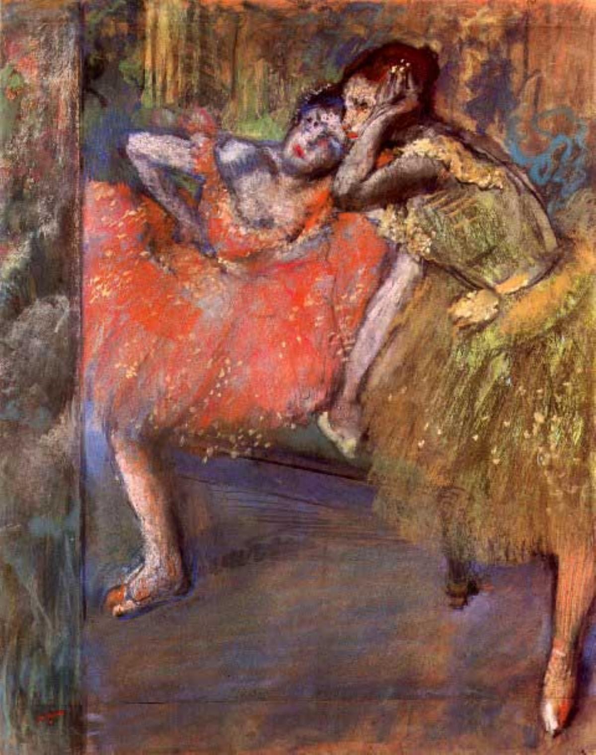 Artist: Degas - Title: Two Dancers Behind The Scenes - Medium: Fine Art Reproduction Giclee on Archival Canvas - Image Size: Approximately 20 inches x 15.75 inches - Framed: Unframed on Unstretched Canvas - Edgar Degas was a French artist famous for his work in painting, sculpture, printmaking and drawing. He is regarded as one of the founders of Impressionism although he rejected the term, and preferred to be called a realist. A superb draftsman, he is especially identified with the subject of the dance, and over half of his works depict dancers. These display his mastery in the depiction of movement, as do his racecourse subjects and female nudes. His portraits are notable for their psychological complexity and depiction of human isolation. - Early in his career, he wanted to be a history painter, a calling for which he was well prepared by his rigorous academic training and close study of classic art. In his early thirties, he changed course, and by bringing the traditional methods of a history painter to bear on contemporary subject matter, he became a classical painter of modern life.