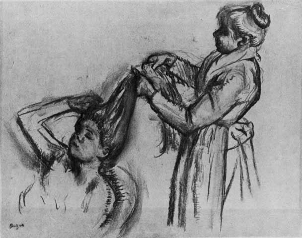 Artist: Degas - Title: Woman Doing Hair [2] - Medium: Fine Art Reproduction Giclee on Archival Canvas - Image Size: Approximately 20 inches x 14.25 inches - Framed: Unframed on Unstretched Canvas - Edgar Degas was a French artist famous for his work in painting, sculpture, printmaking and drawing. He is regarded as one of the founders of Impressionism although he rejected the term, and preferred to be called a realist. A superb draftsman, he is especially identified with the subject of the dance, and over half of his works depict dancers. These display his mastery in the depiction of movement, as do his racecourse subjects and female nudes. His portraits are notable for their psychological complexity and depiction of human isolation. - Early in his career, he wanted to be a history painter, a calling for which he was well prepared by his rigorous academic training and close study of classic art. In his early thirties, he changed course, and by bringing the traditional methods of a history painter to bear on contemporary subject matter, he became a classical painter of modern life.