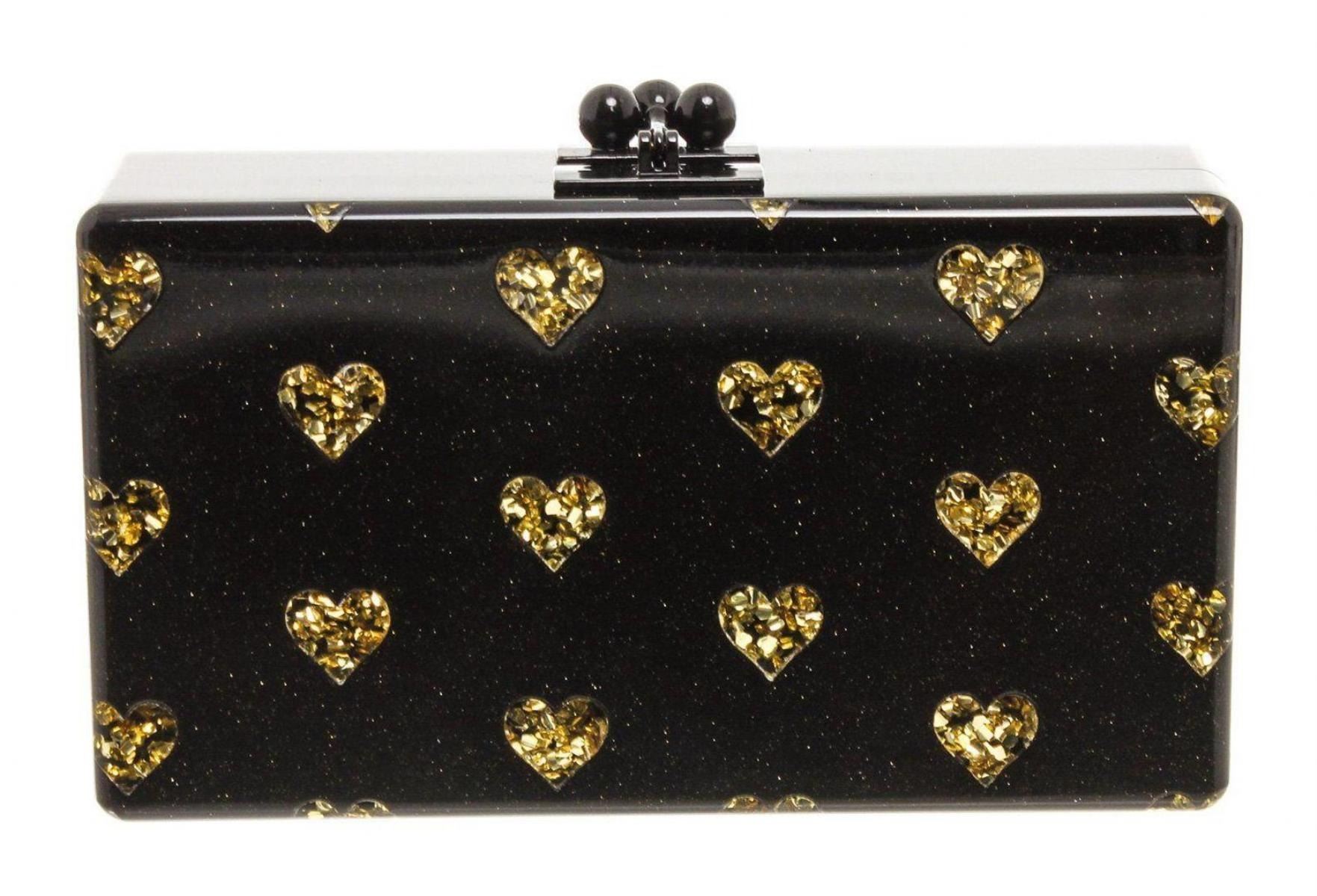 Black acrylic Edie Parker Heart clutch with multi-tonal hardware, gold-tone heart accents at front, tonal interior, mirror at interior wall and flip-lock closure at top. Measurements: Length: 6.75 in / 17 cm Width: 1.75 in / 4 cm 3.75 in / 10 cmCONDITION: Pre-Owned Good overall, please see photographs for detail.