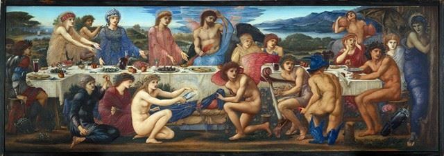 Artist: Edward Burne-Jones - Title: The Feast of Peleus - Medium: Fine Art Reproduction Giclee on Canvas - Image Size: Approximately 11.5 inches x 32 inches - Unframed on Unstretched Canvas - Biography: Sir Edward Coley Burne-Jones, 1st Baronet, (28 August 1833 - 17 June 1898) was a British artist and designer associated with the phase of the Pre-Raphaelite movement, who worked with William Morris on decorative arts as a founding partner in Morris, Marshall, Faulkner & Co.