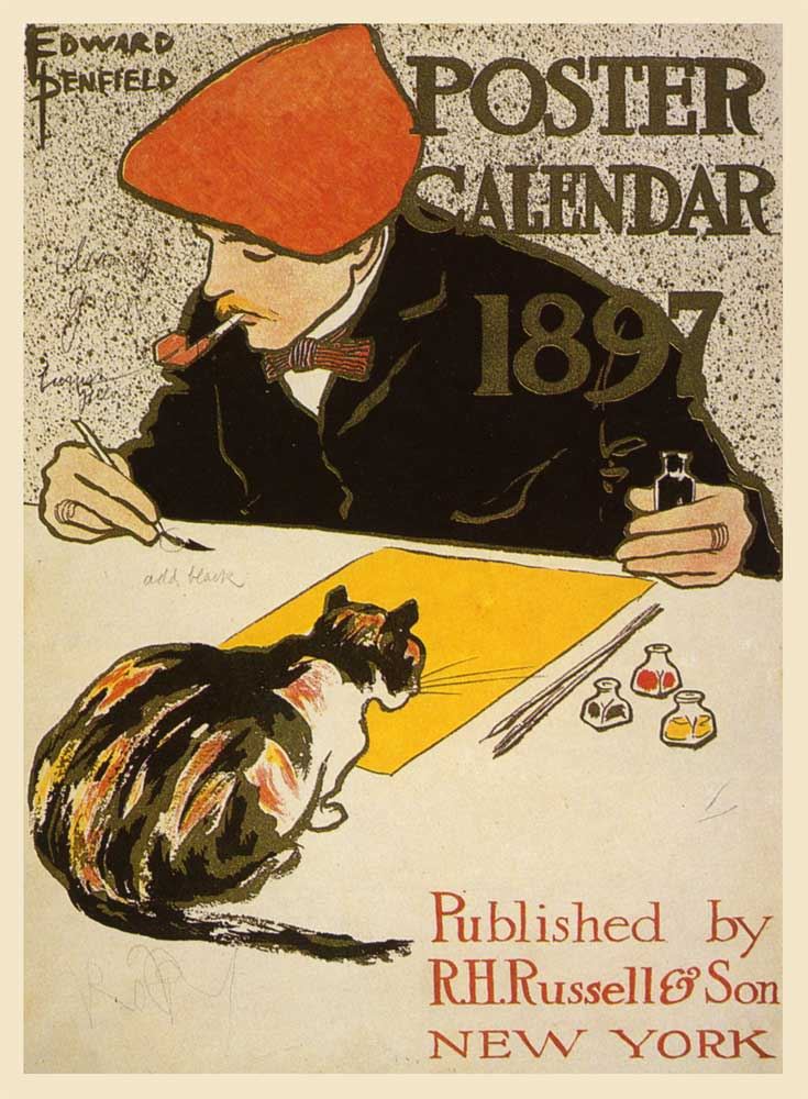 Artist: Edward Penefeild Title: Poster Calender 1897 Medium: Fine Art Reproduction Giclee on Canvas Image Size: Approximately 20 inches x 14.75 inches Unframed on Unstretched Canvas Edward Penefeild posters were bold and stood out from a distance with great clarity. As artists like Alphonse Mucha, Théophile Steinlen and Toulouse-Lautrec popularized the poster in Europe, Penfield accomplished the same feat in the United States. For his posters, Penfield utilized simple shapes and a limited palette of colors that lent themselves to the primitive methods of reproduction of the era.
