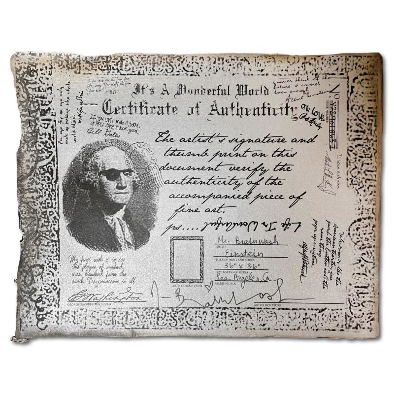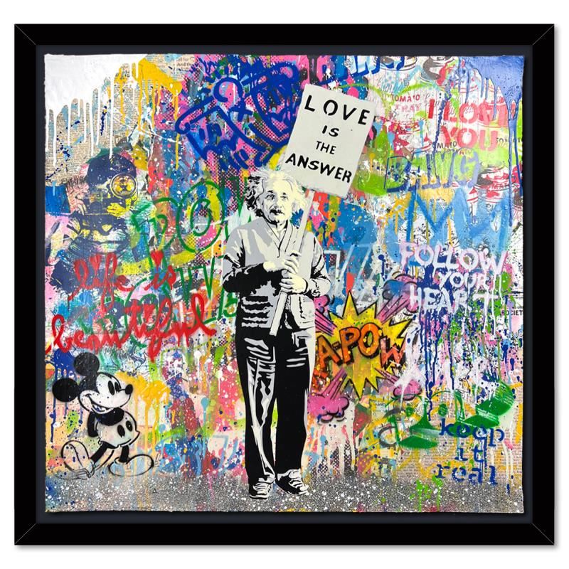 "Einstein" is a mixed media original on deckle edge paper by Mr. Brainwash, hand signed inverso and bearing the thumbprint of the artist. This piece comes custom framed. Includes Certificate of Authenticity. Measures approx. 40" x 40" (frame), 36" x 36" (image).