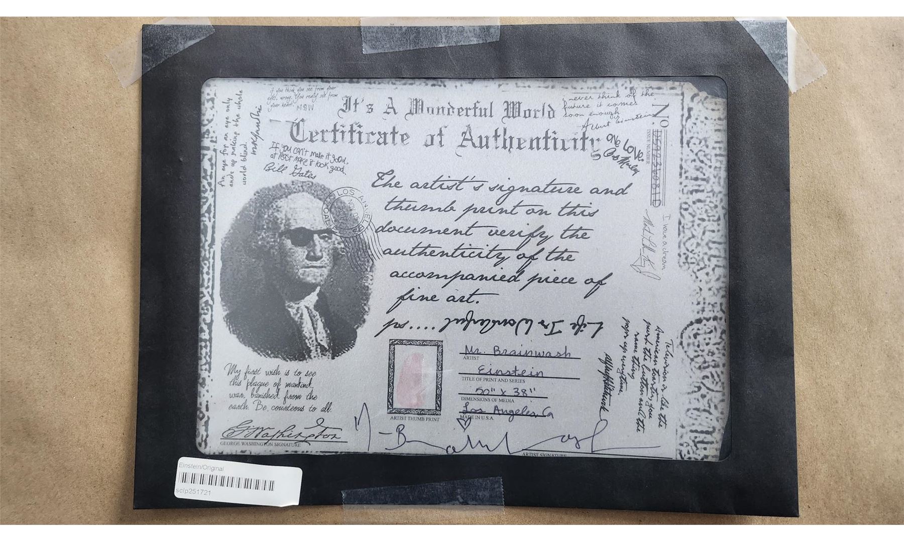 "Einstein" by Mr. Brainwash is a vibrant mixed-media artwork featuring Albert Einstein holding a sign that reads "Love is the Answer," blending street art with pop culture themes. This dynamic piece measures 50 x 38 inches and comes with a Certificate of Authenticity. Signed and thumbprinted by the artist, it showcases Mr. Brainwash's distinctive style and attention to detail. The bold colors, graffiti-style layers, and cultural references make it a striking addition to any contemporary art collection.