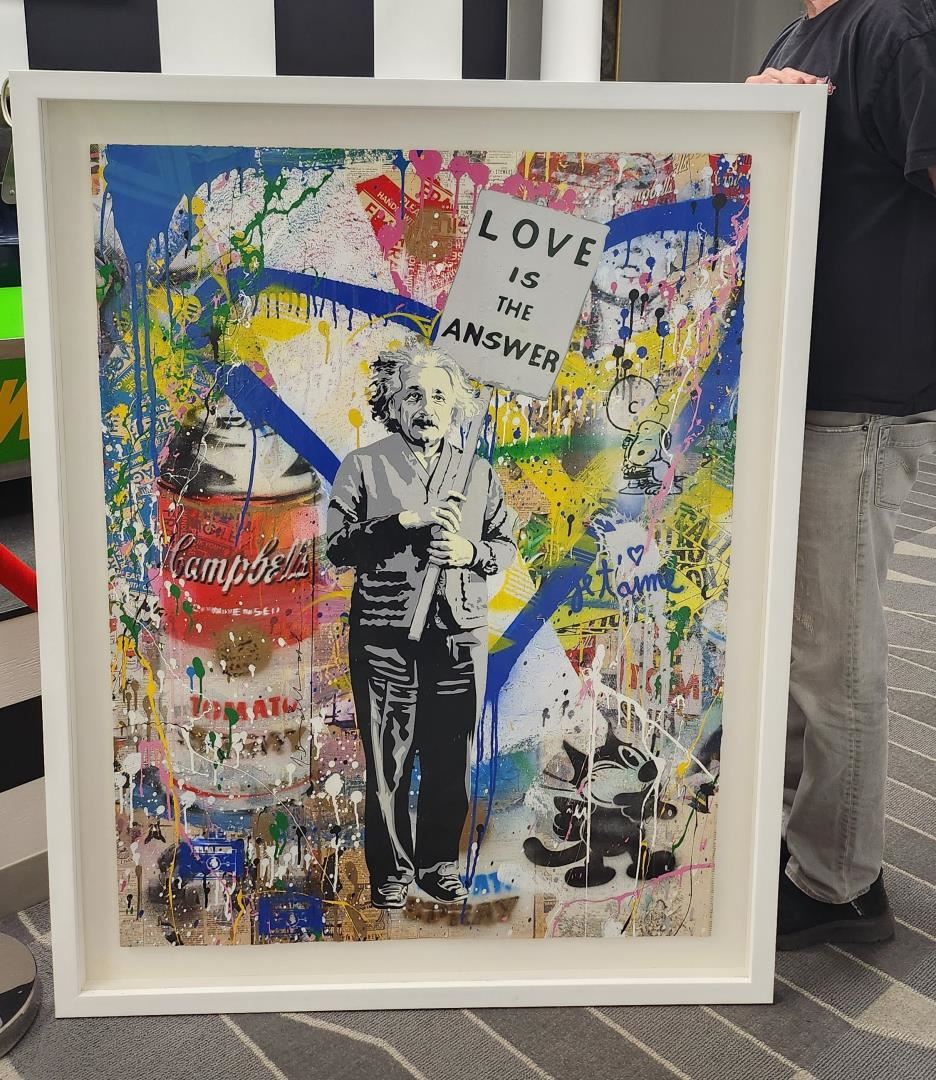 "Einstein" by Mr. Brainwash is a vibrant mixed-media artwork featuring Albert Einstein holding a sign that reads "Love is the Answer," blending street art with pop culture themes. This dynamic piece measures 50 x 38 inches and comes with a Certificate of Authenticity. Signed and thumbprinted by the artist, it showcases Mr. Brainwash's distinctive style and attention to detail. The bold colors, graffiti-style layers, and cultural references make it a striking addition to any contemporary art collection.