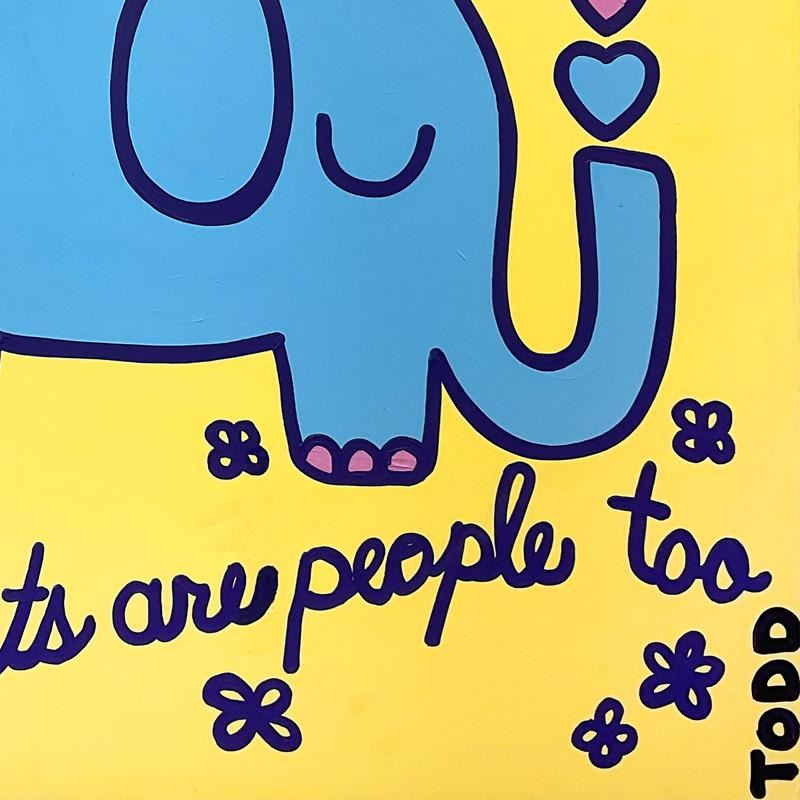"Elephants Need Love Too" is an original acrylic painting on gallery wrapped canvas by Todd Goldman, hand signed by the artist. Includes Letter of Authenticity. Measures approx. 48" x 48" (image). This piece had a small puncture hole on the bottom-center