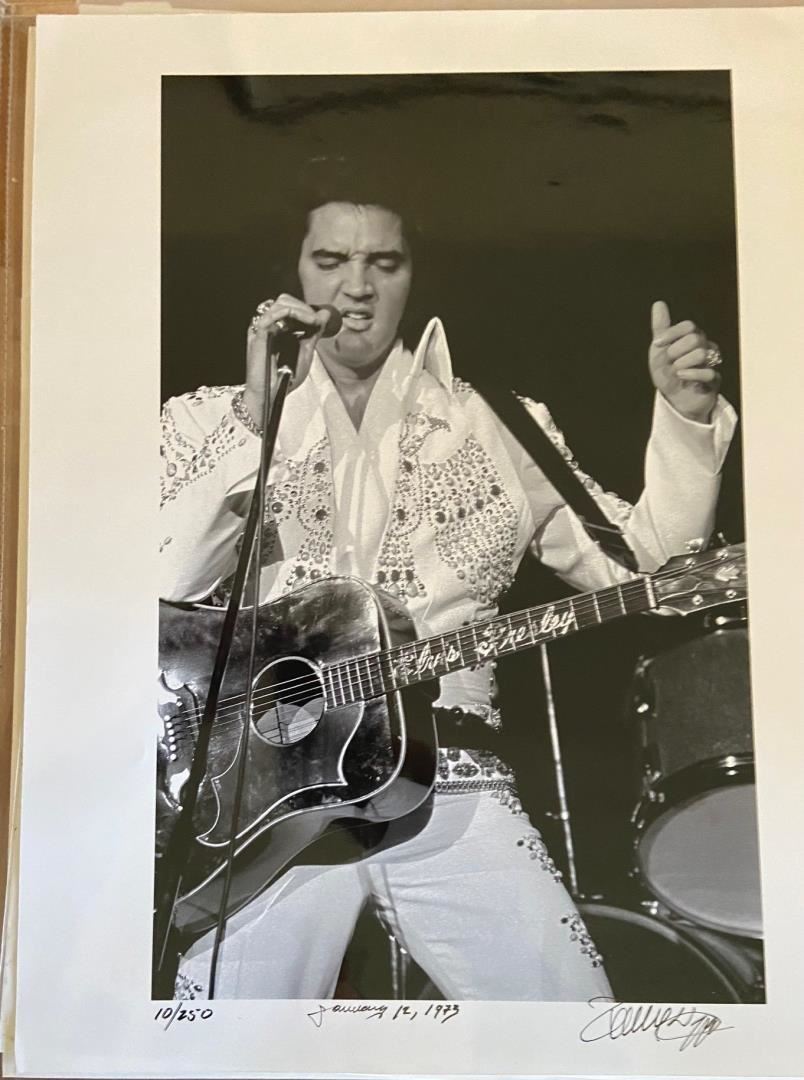 A stunning 20x16" photo of Elvis performing live. Signed Limited Edition 10/250 by famed Rock photographer Robert M Knight. Slight ripple upper right but will not show once framed. Image is 17.5x11