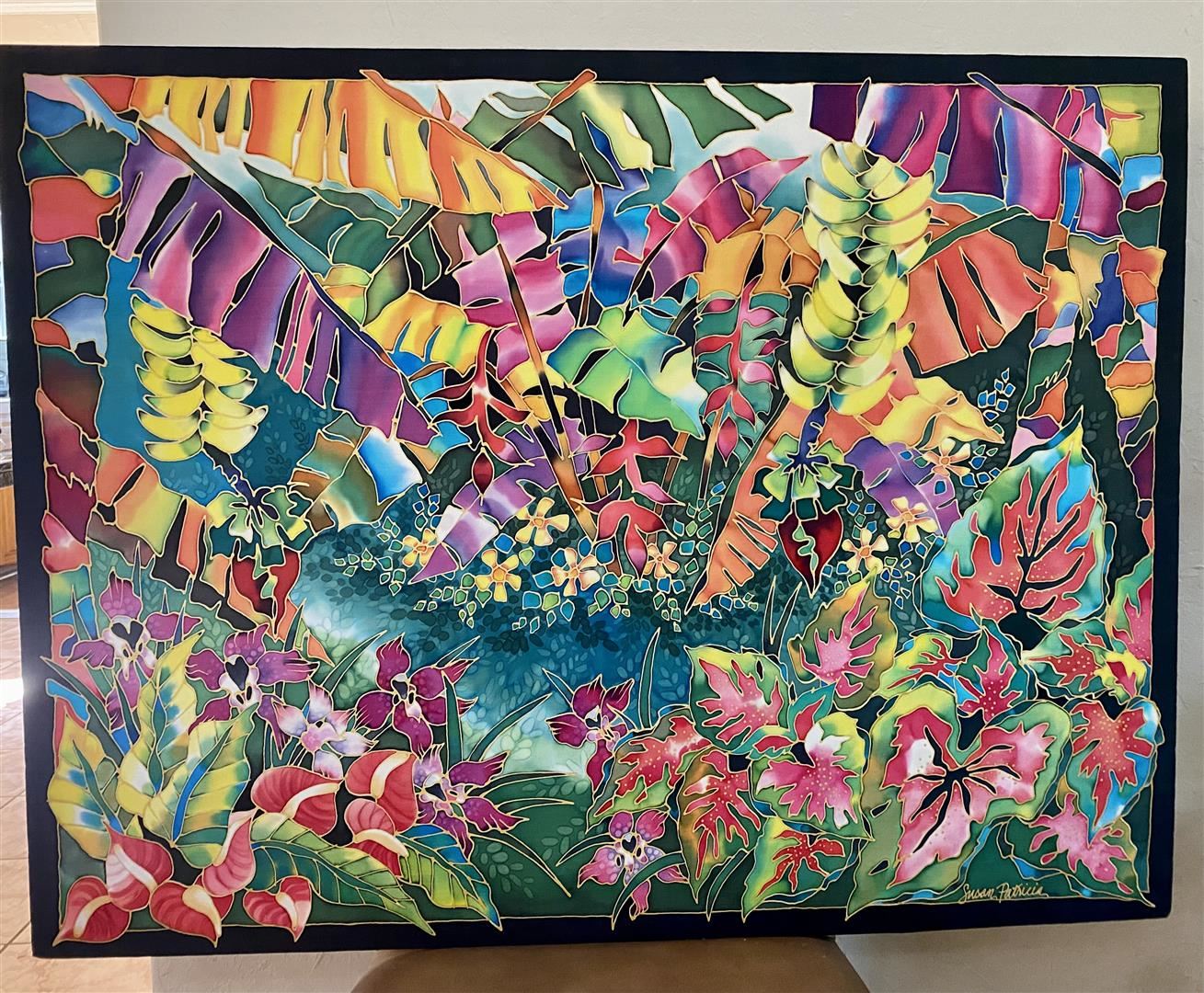 Hawaii's famed artist Susan Patricia's "Enchanted Jungle". Original on silk. 41.75x31.75"
