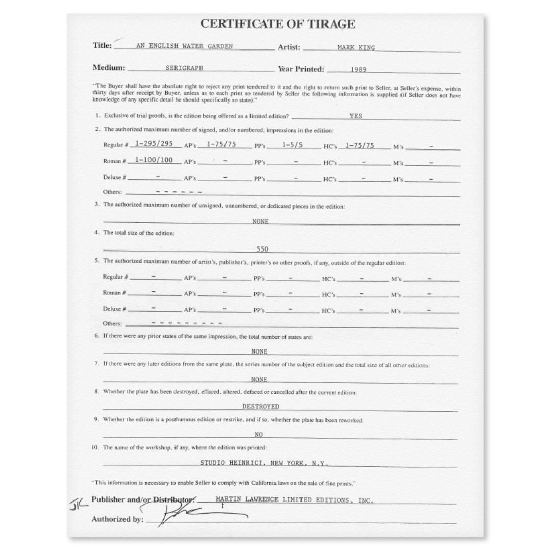 "English Water Garden" is a limited edition serigraph on paper by Mark King (1931-2014). Hand signed and numbered this piece comes with a letter of authenticity and measures approximately 28" x 37" (image).