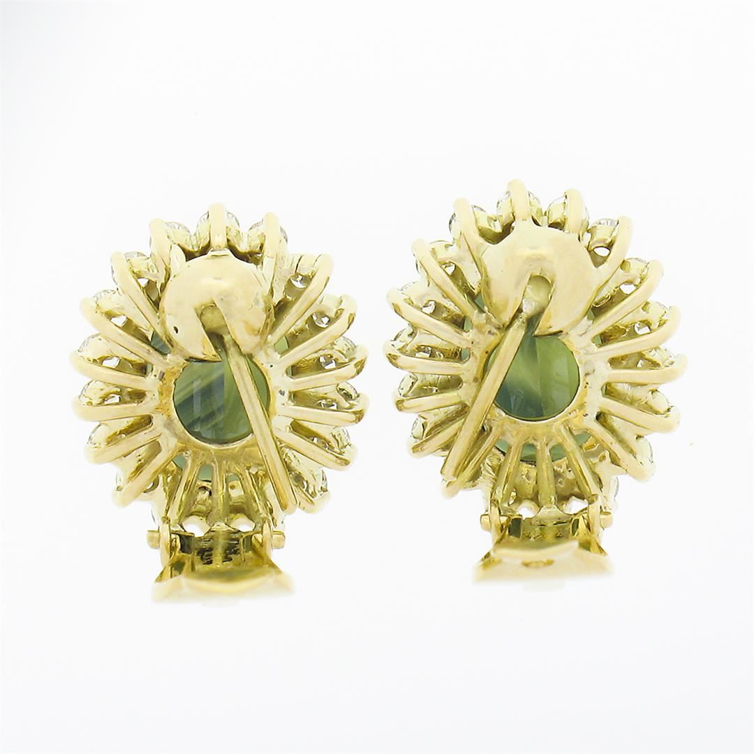 A pair of solid 14k yellow gold earrings, with 2 Gia certified oval cut natural green sapphires (7.37ctw), surrounded with a halo of 36 round brilliant cut natural diamonds (G/H - VS1/VS2 ; 0.81ctw). The earrings measure approximately 15.20x12.30mm and weigh a total of 6.70 grams.