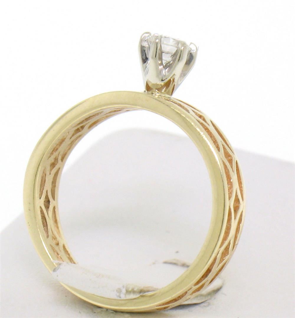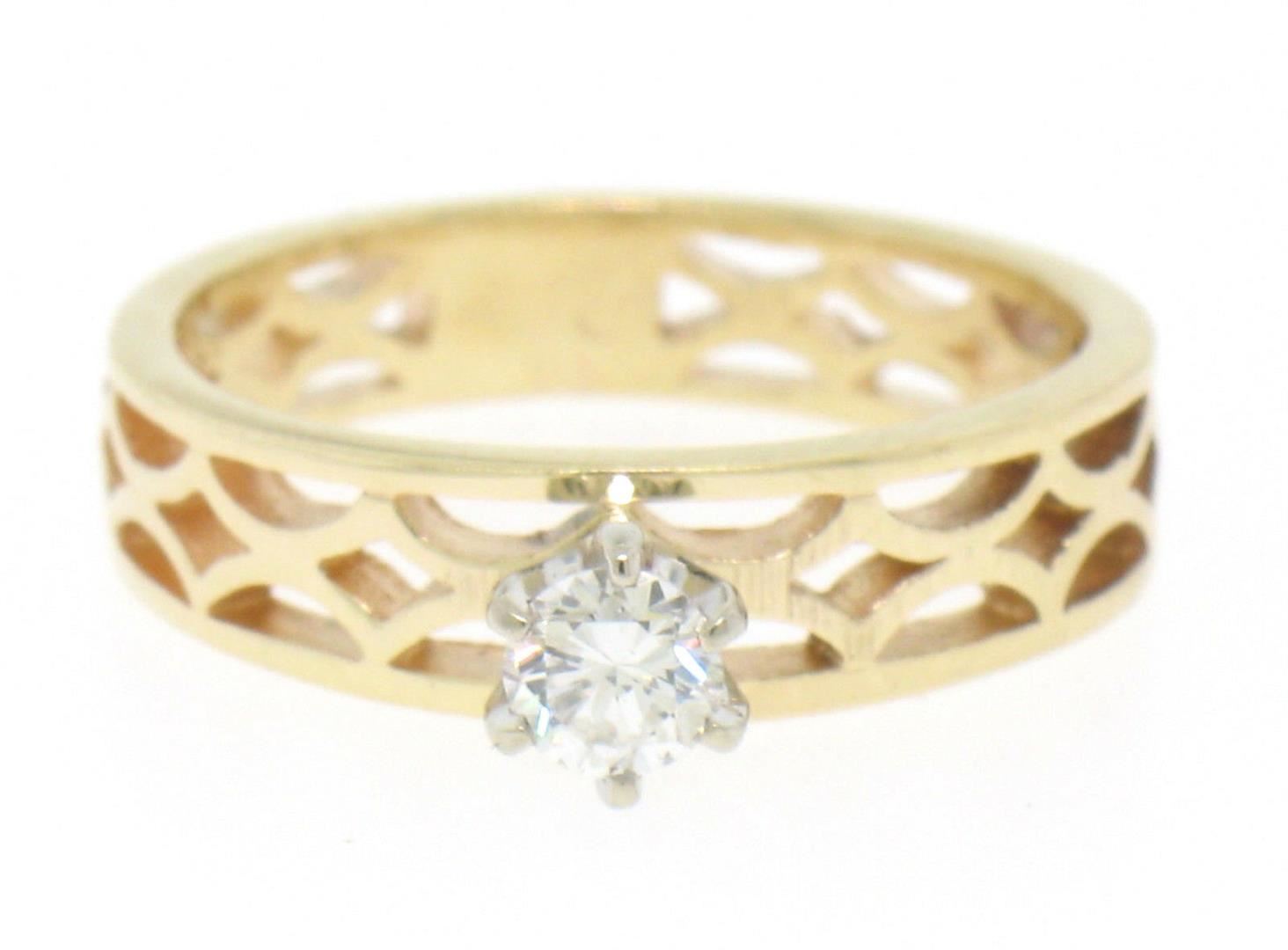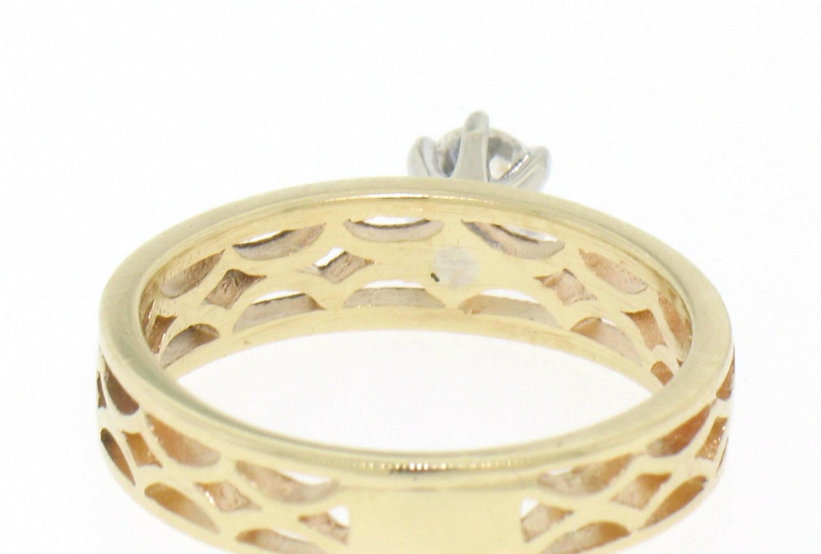 One 14k Yellow Gold 0.17ct Round Diamond Solitaire Ring w/ Pierced Open Work Setting. Item Details: Material: Solid 14k Yellow Gold w/ 14k White Gold Head, Weight: 2.40 Grams, Stone(s): (1) Natural Genuine Diamond - Round Brilliant Cut - Six-Prong Set - F Color - VS1 Clarity - 0.17ct (approx.), Size: 4.0 , Width: 4.25mm, Condition: Estate piece in like new condition.