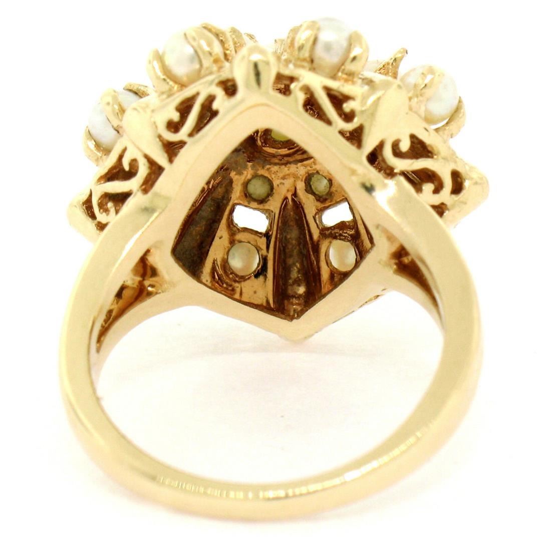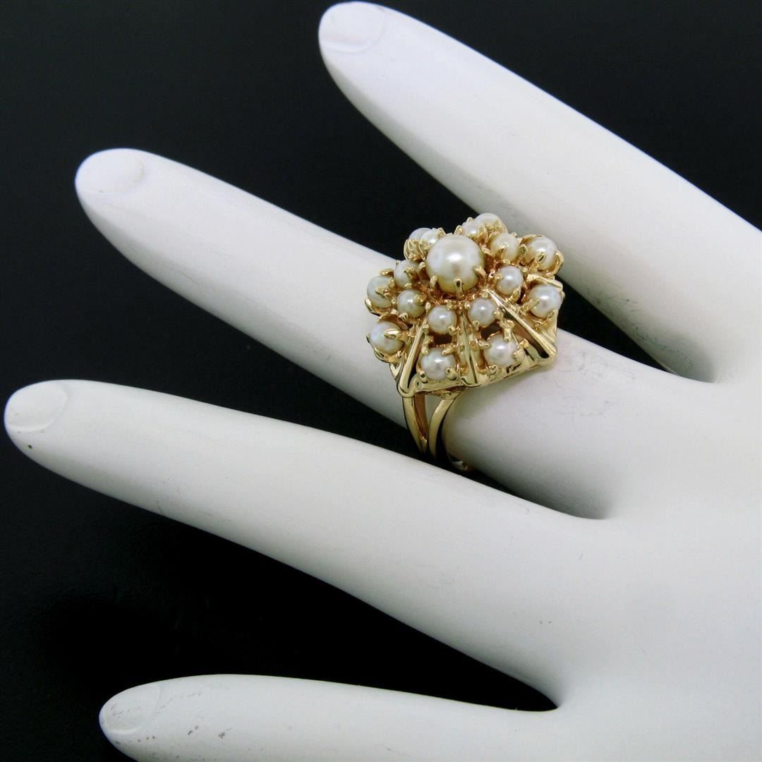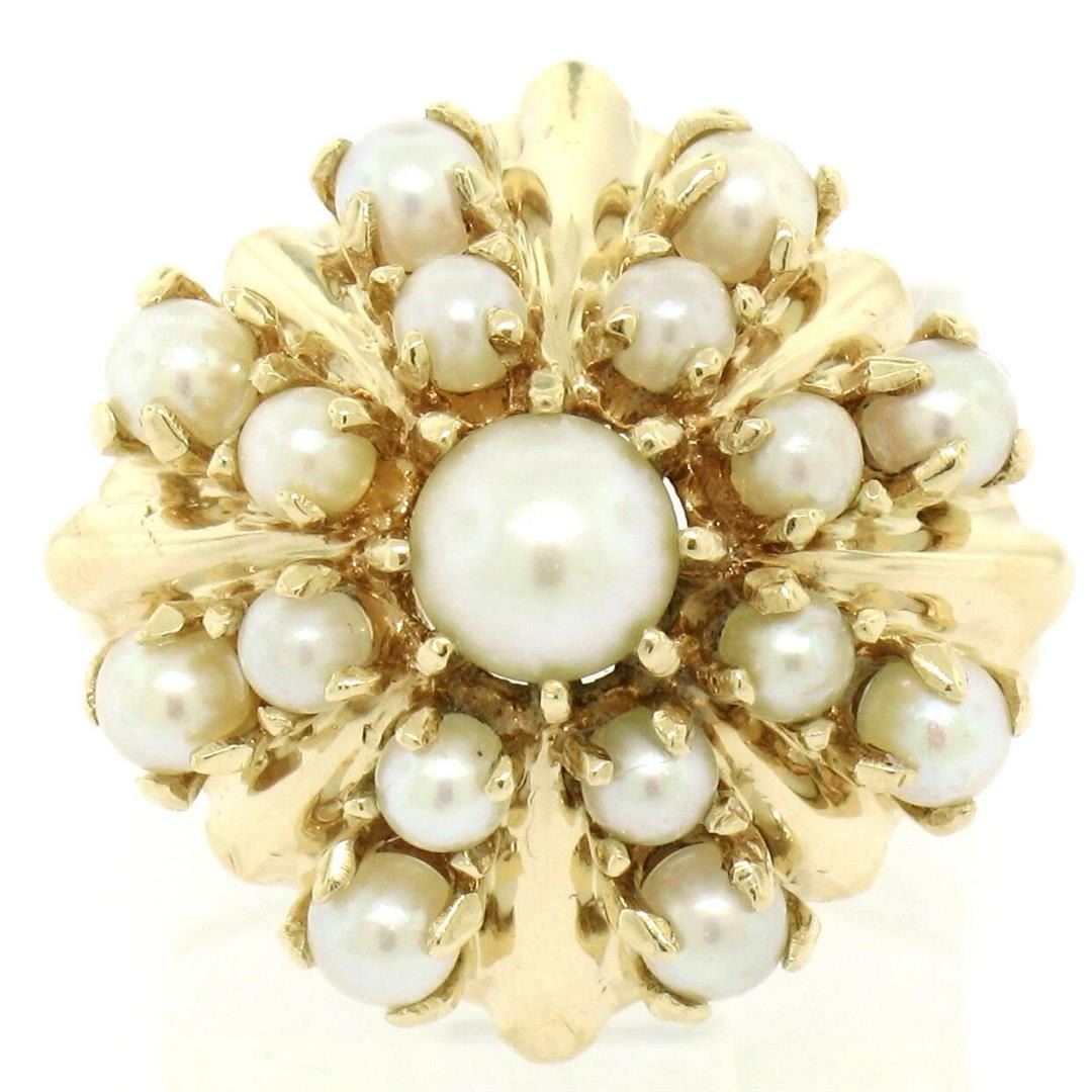A solid 14k yellow gold cluster ring set with 17 genuine cultured pearls with an ivory color: a 5.0mm pearl at the center, a halo of 8 2.5mm pearls on the inside, and a halo of 8 2.9mm pearls on the outside. The ring is size 5.0, weighs a total of 6.98 grams, and measures 19.20mm wide.