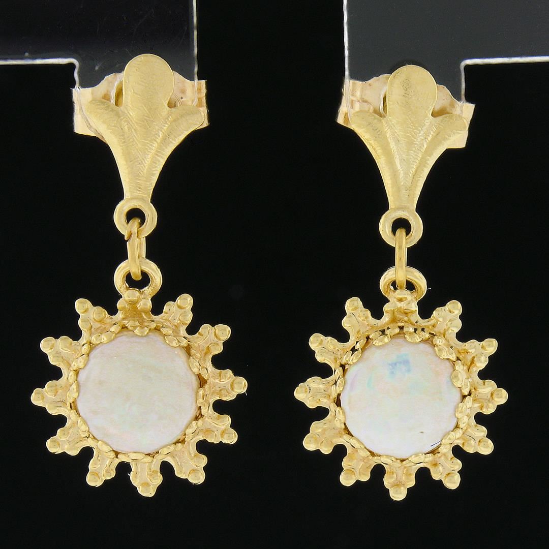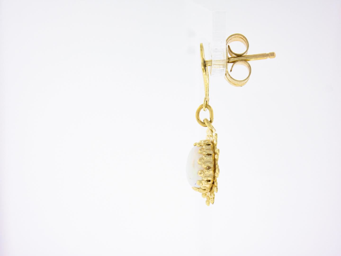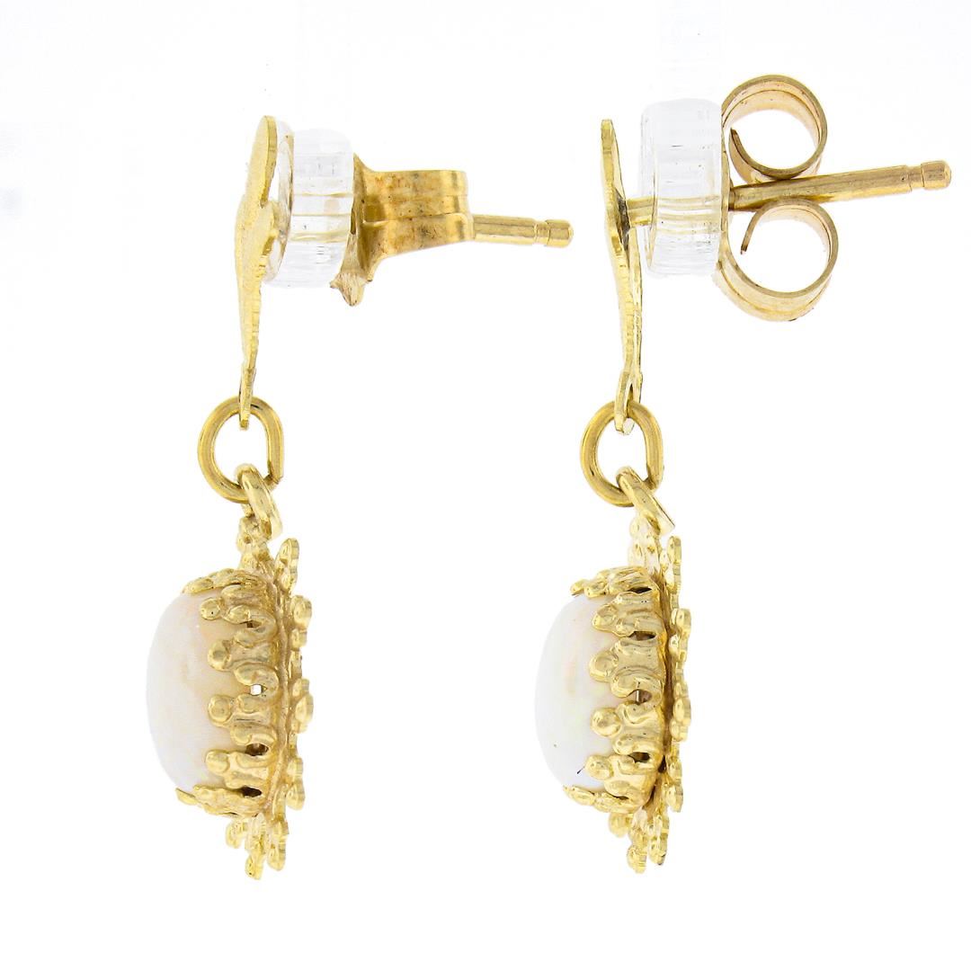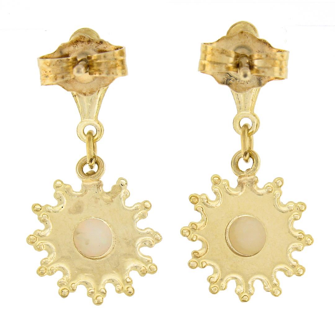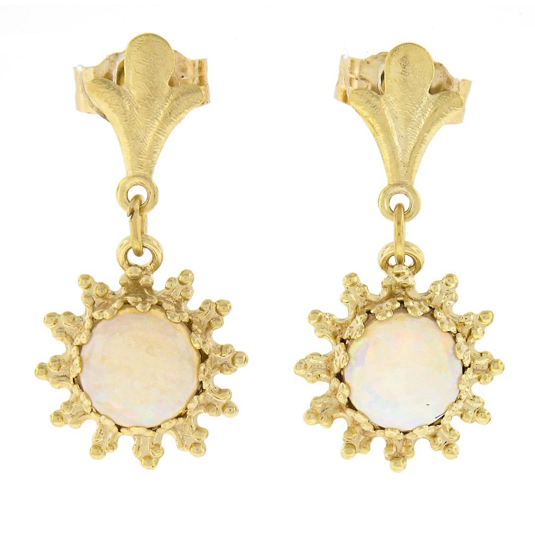 A solid 14k yellow gold dangle drop earrings, with 2 round cabochon cut natural opals (6mm). The earrings measure approximately 20x10mm and weigh a total of 1.40 grams.
