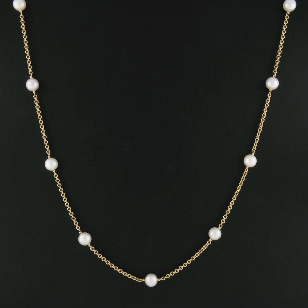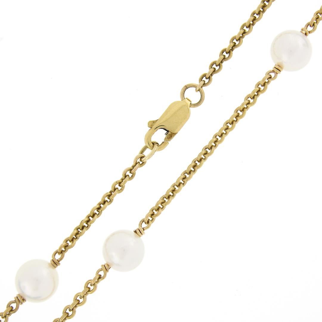 A solid 14k yellow gold by the yard cable link necklace, with 12 round shape cultured pearls (7.5-7.75mm). It weighs a total of 17.2 grams, measures 2.45mm wide, and measures 23.5 inches in length.