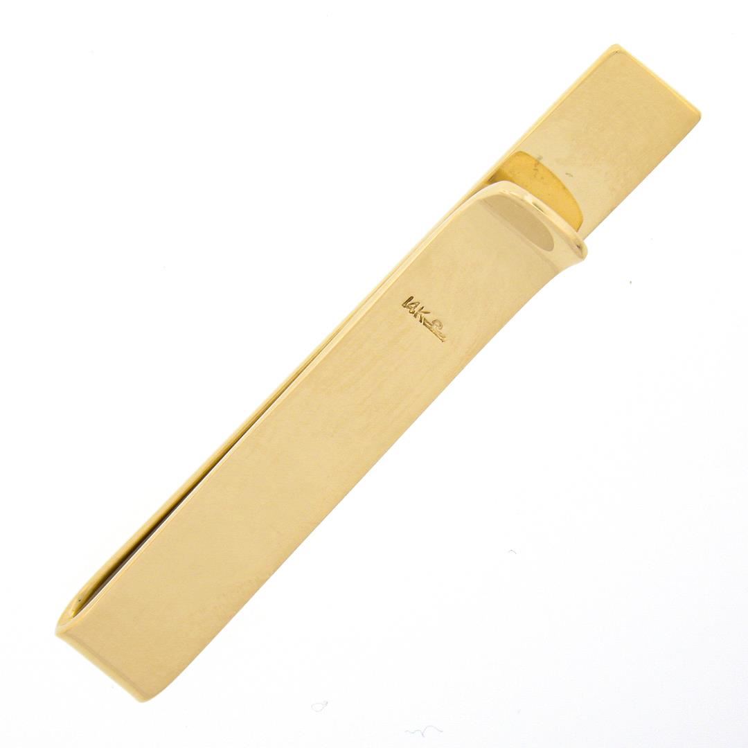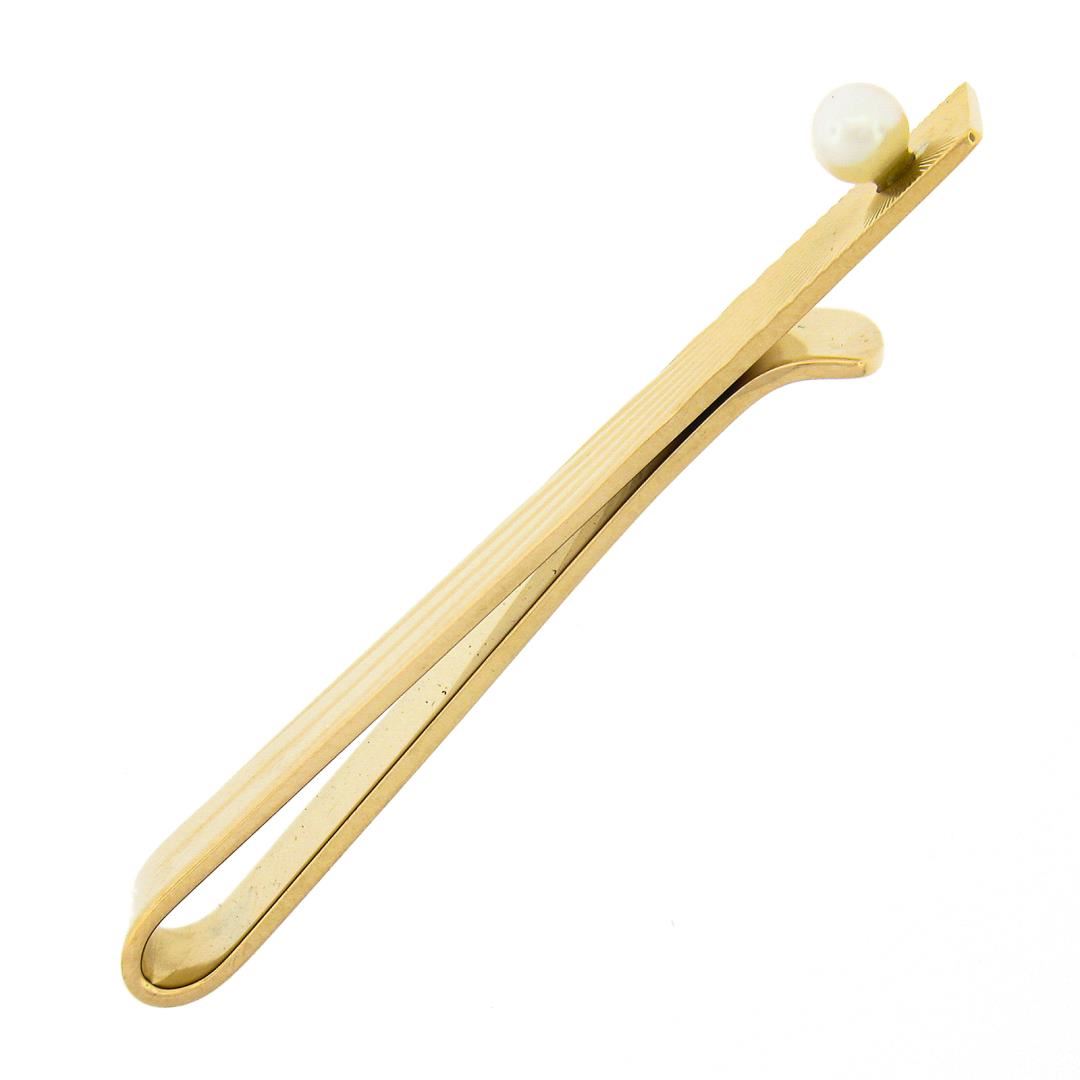 A solid 14k yellow gold tie bar clip, with 1 round shape cultured pearl (3.5mm ). Measures 44.57x6.4mm and weighs a total of 5.95 grams.