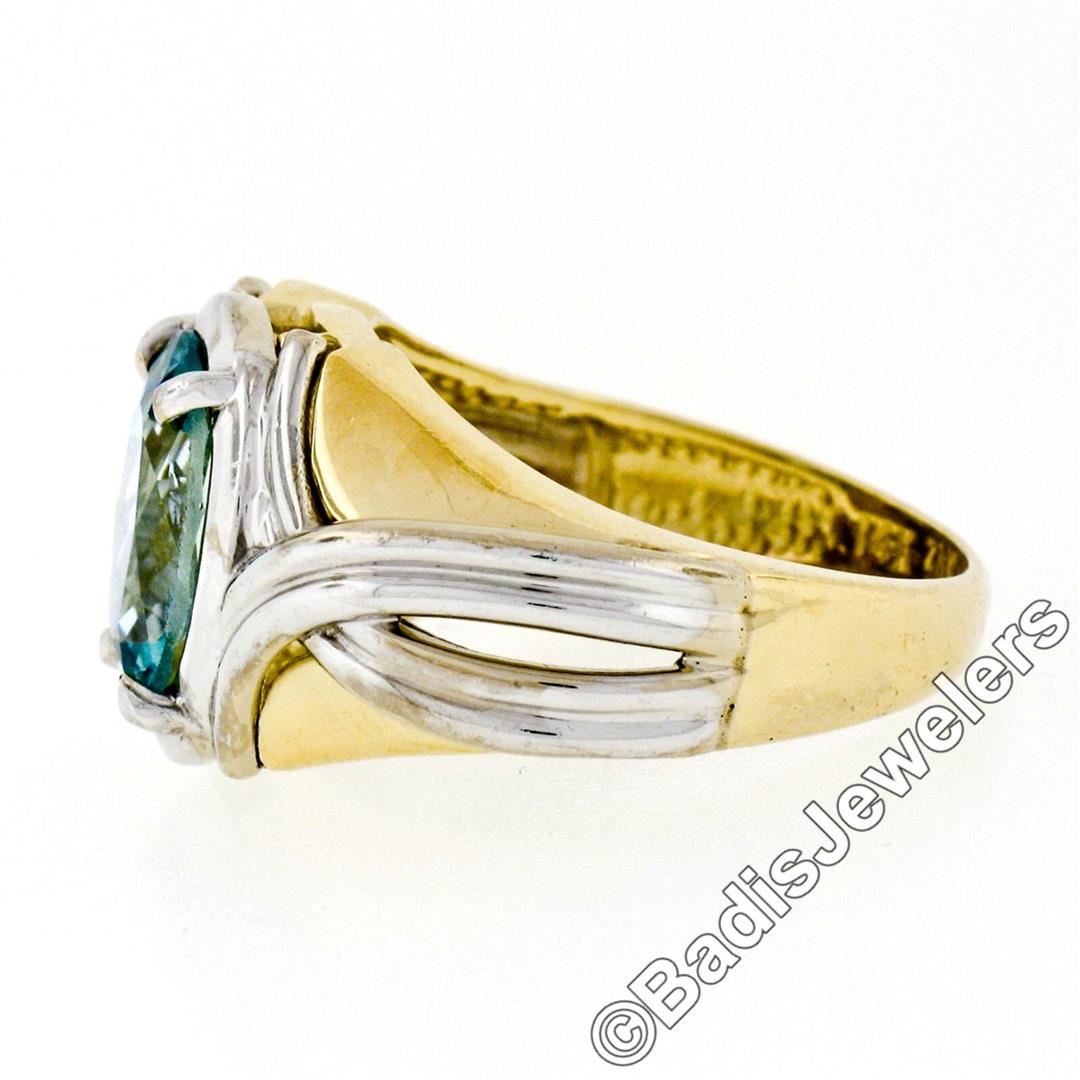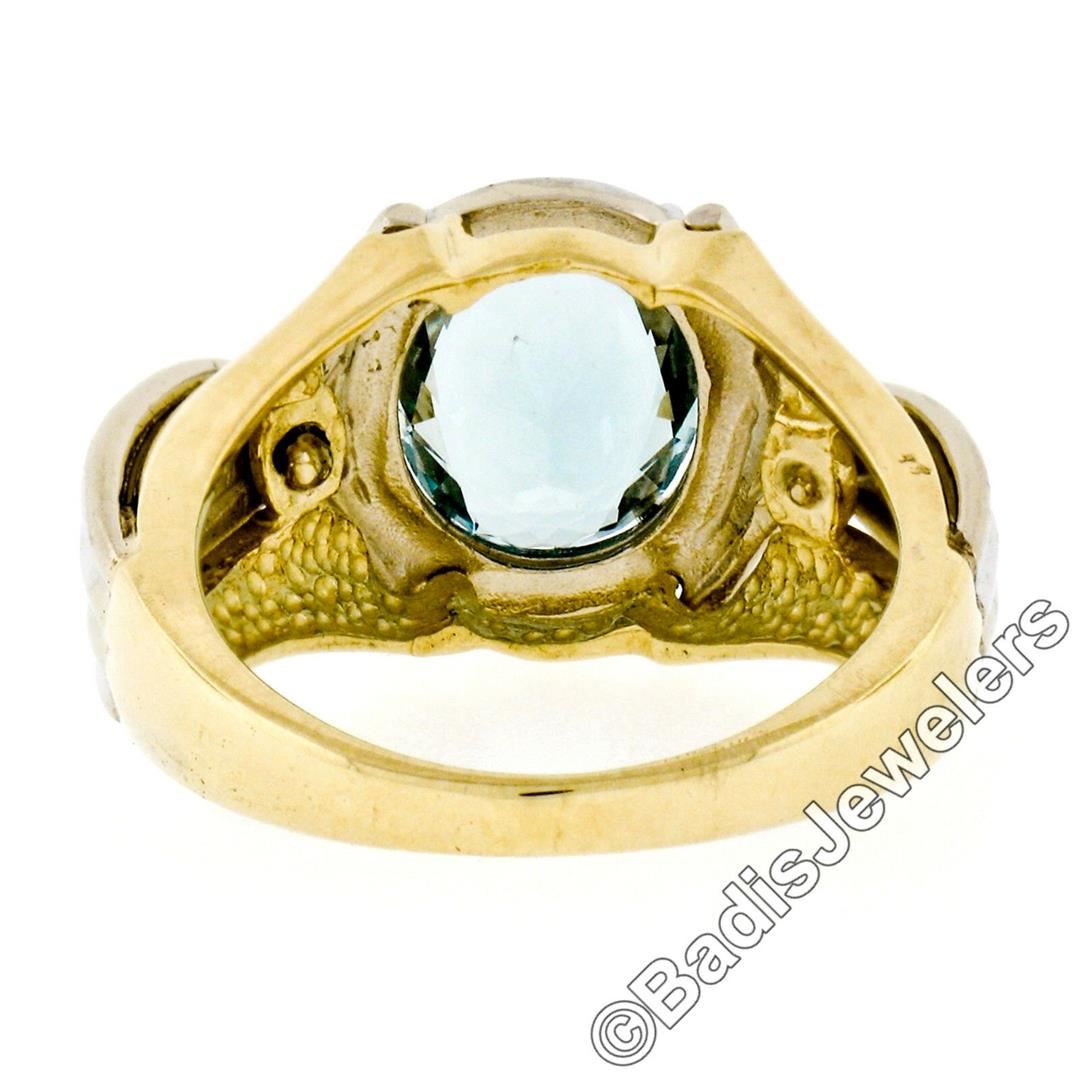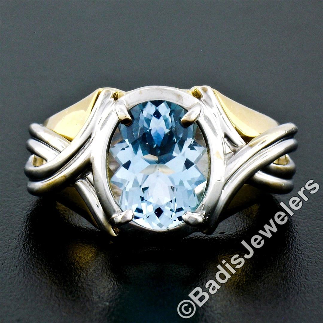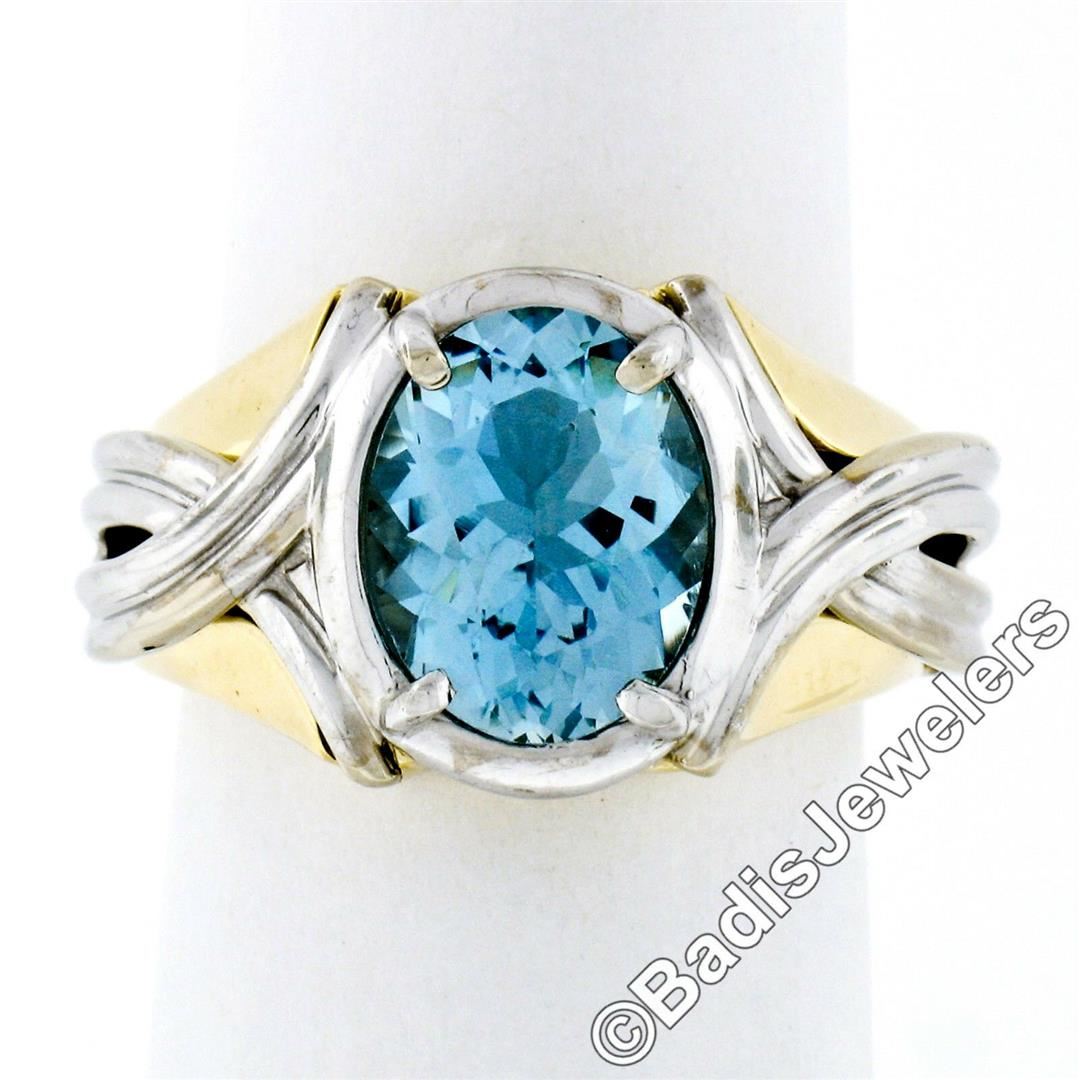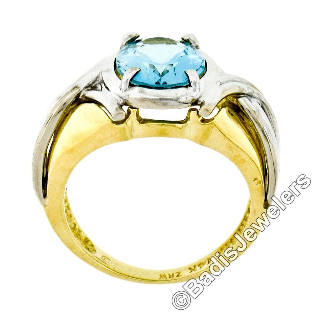 A 14kt yellow and white gold grooved ring featuring an oval aquamarine (2.10ct) prong set at its center.The ring is size 6, weighs a total of 6.17 grams, and measures 12.45mm wide.