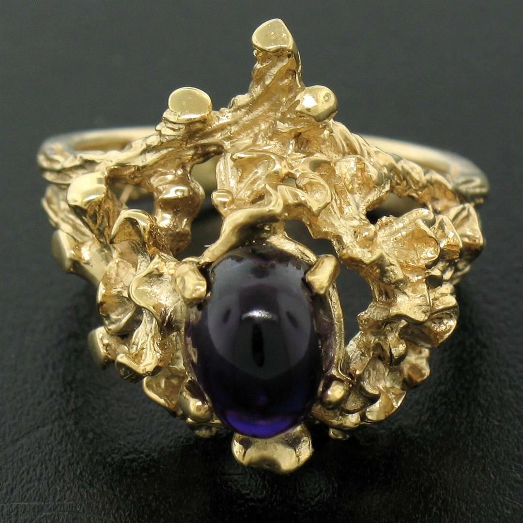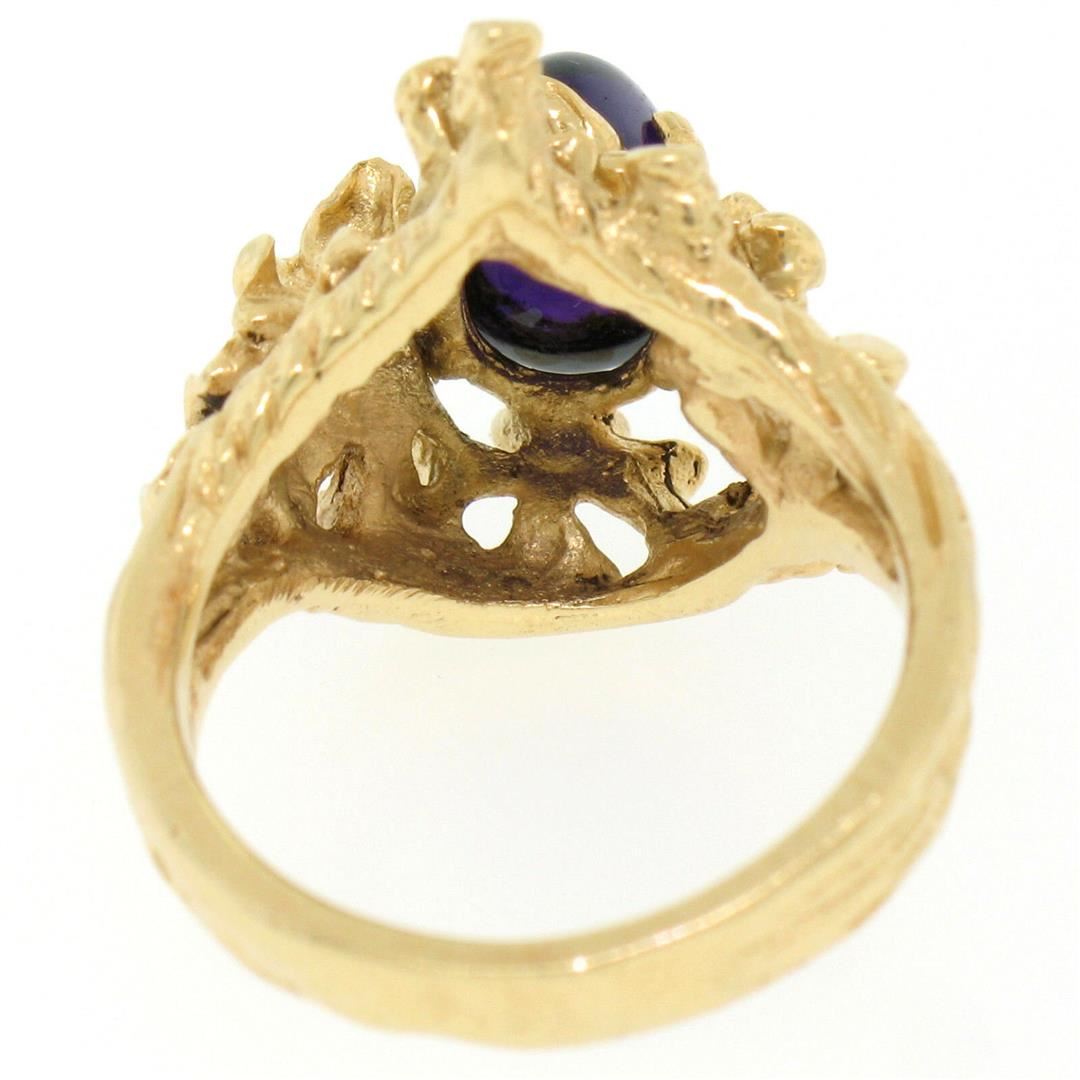 A like new 14kt yellow gold ring set with a 1.98ct oval cabochon amethyst. The ring is size 5.5, weighs a total of 7.38 grams, and measures 18.48mm wide.