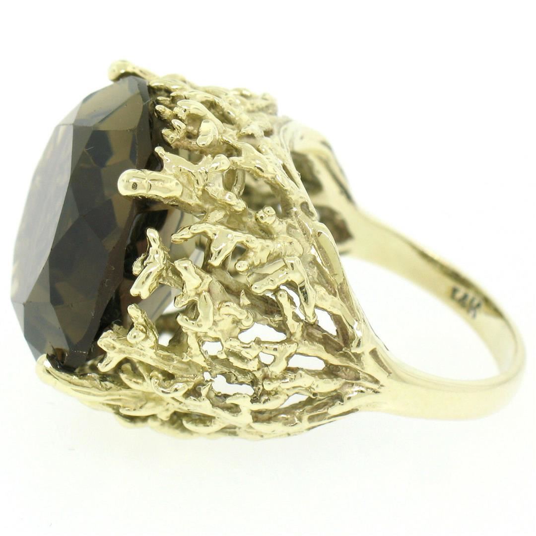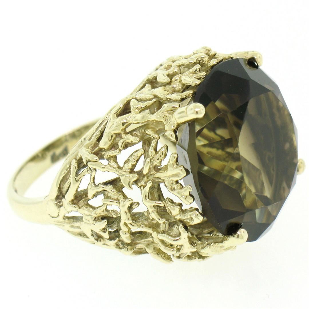 A 14kt yellow gold cocktail ring featuring a 14.13ct round brilliant cut smoky topaz prong set above an open work coral reef design. The ring is size 7.0, weighs a total of 14.37 grams, and measures 19.95mm wide.