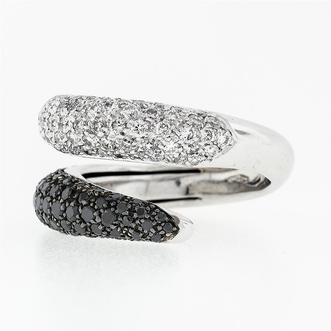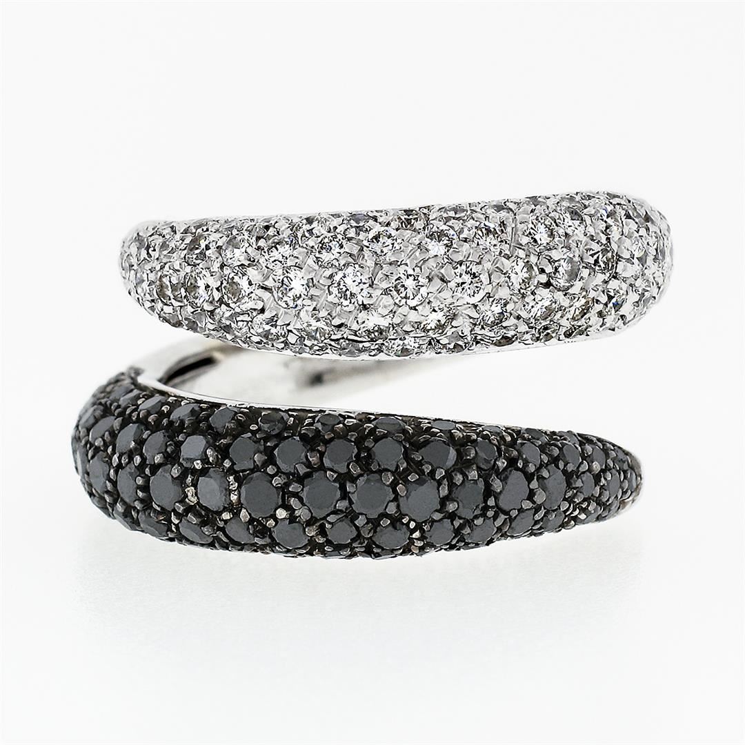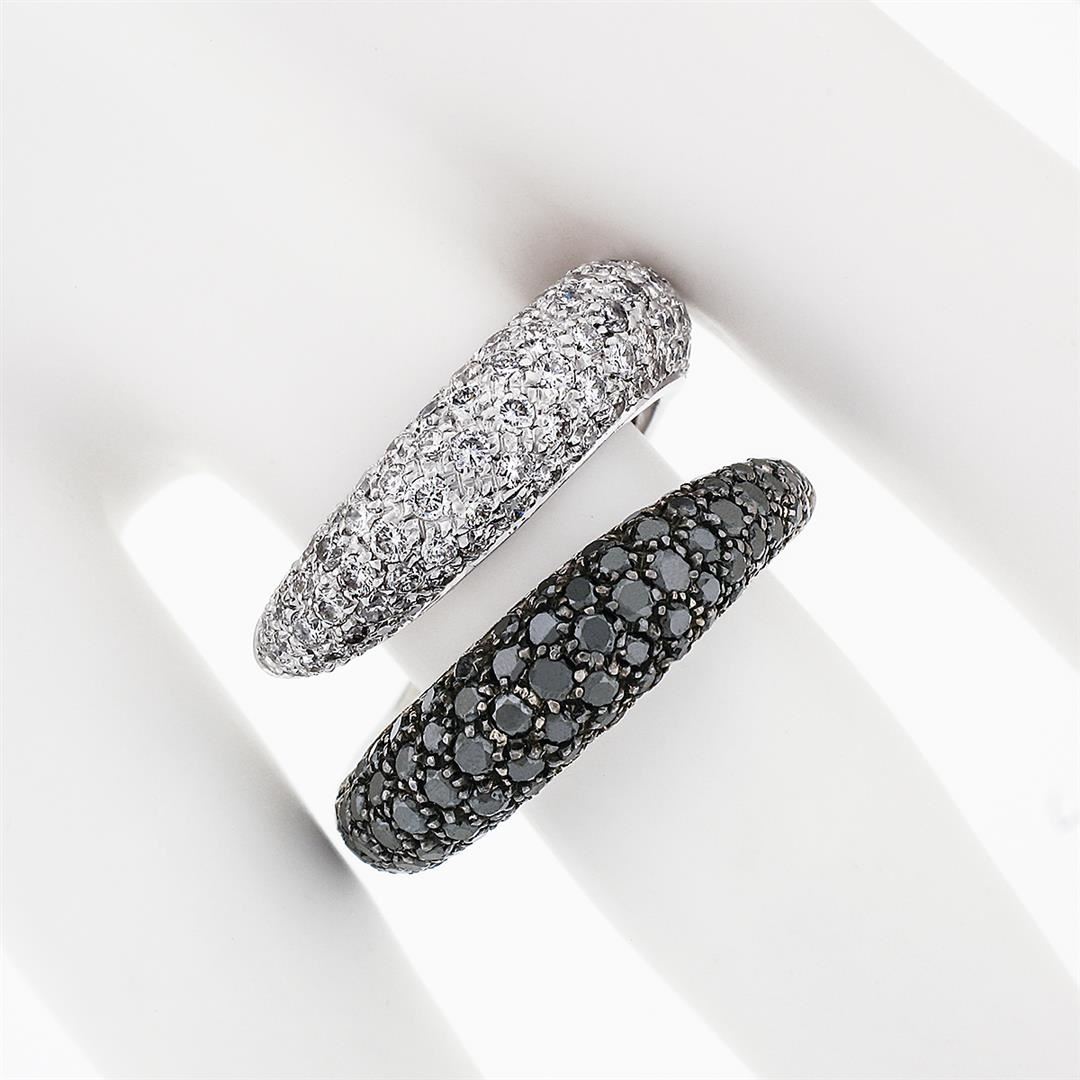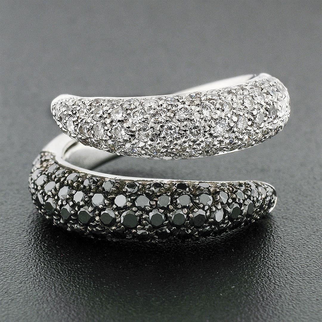 A solid 18k white gold wrap band ring, with 88 round brilliant cut natural diamonds (F - VS2/SI1 ; 0.90ctw). and 88 round brilliant cut natural diamonds (Fancy Black Color ; 0.90ctw). The ring is size 9.0, weighs a total of 12.71 grams, and measures 14.2mm wide.