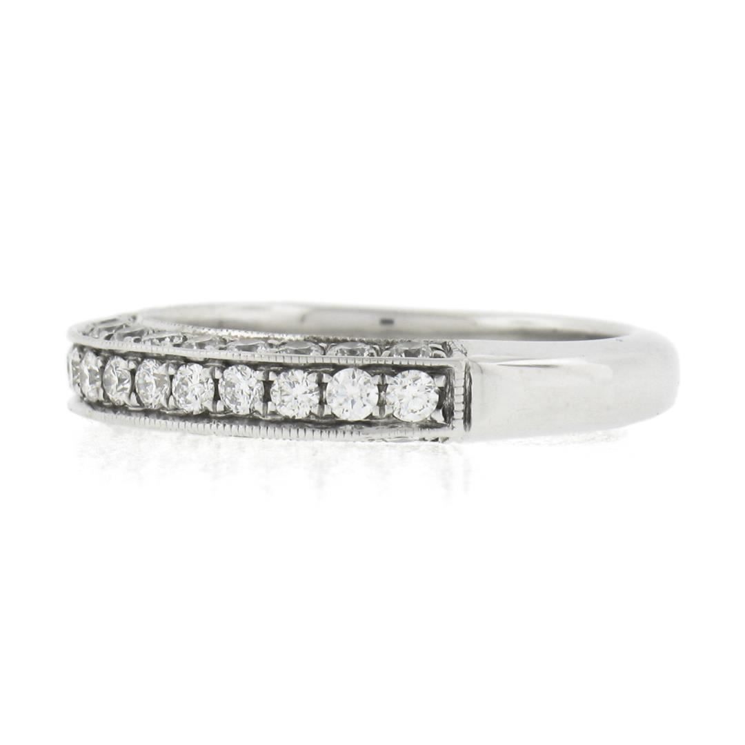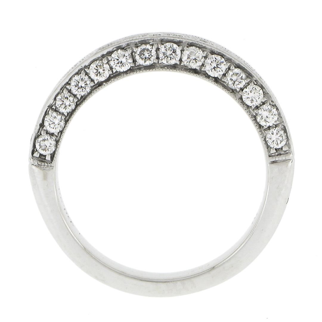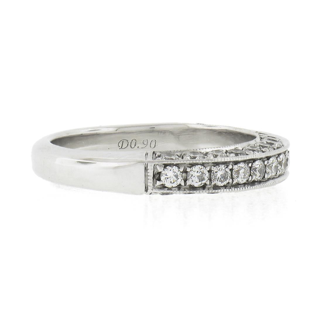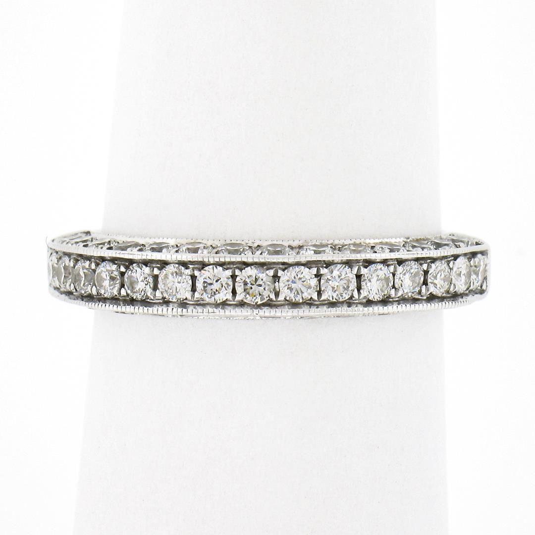 A solid 18k white gold band ring, with 43 round cut natural diamonds (G/H -VS1/VS2 w/ a few SI1 ; 0.90ctw). The ring is size 6.5, weighs a total of 4.69 grams, and measures 3.7mm wide.