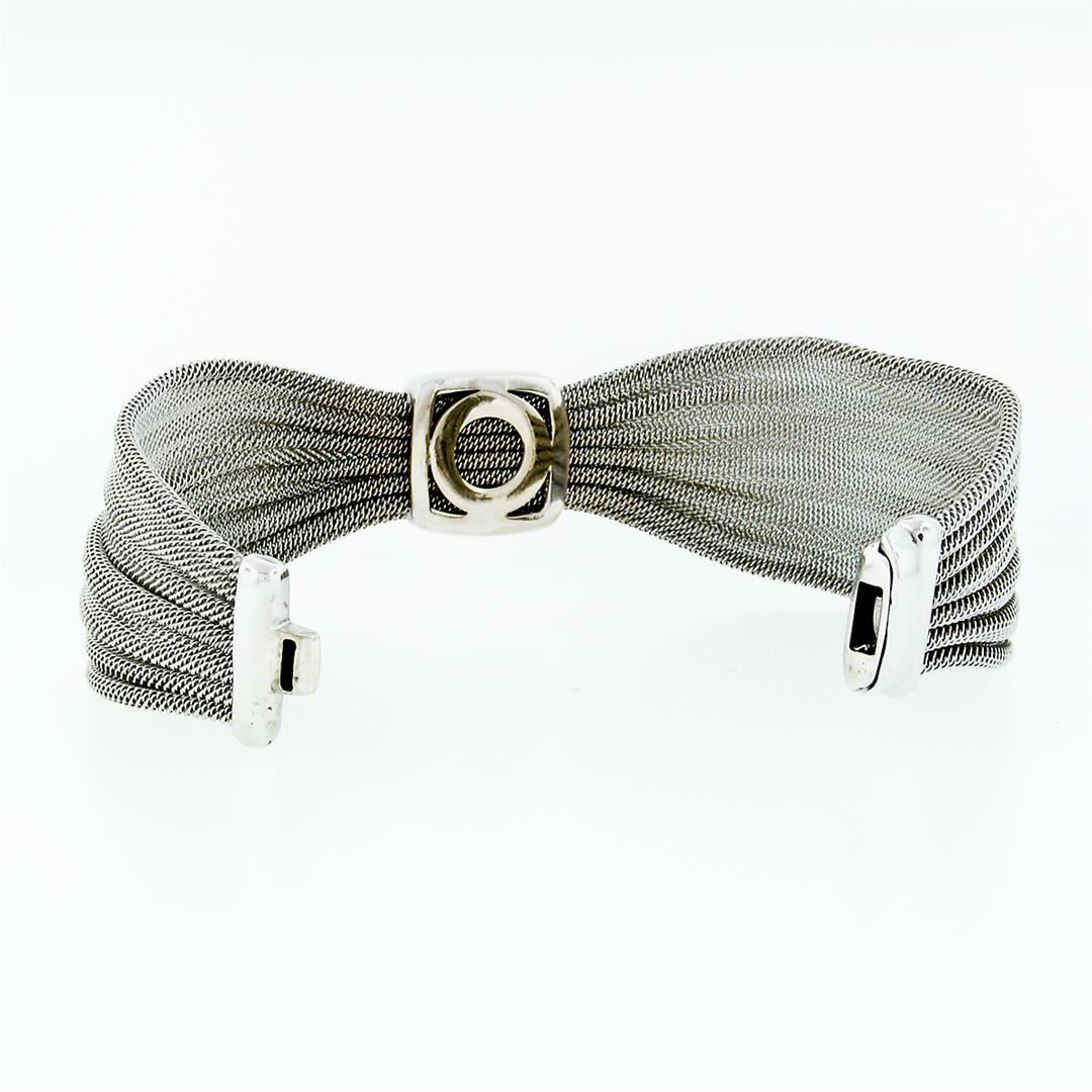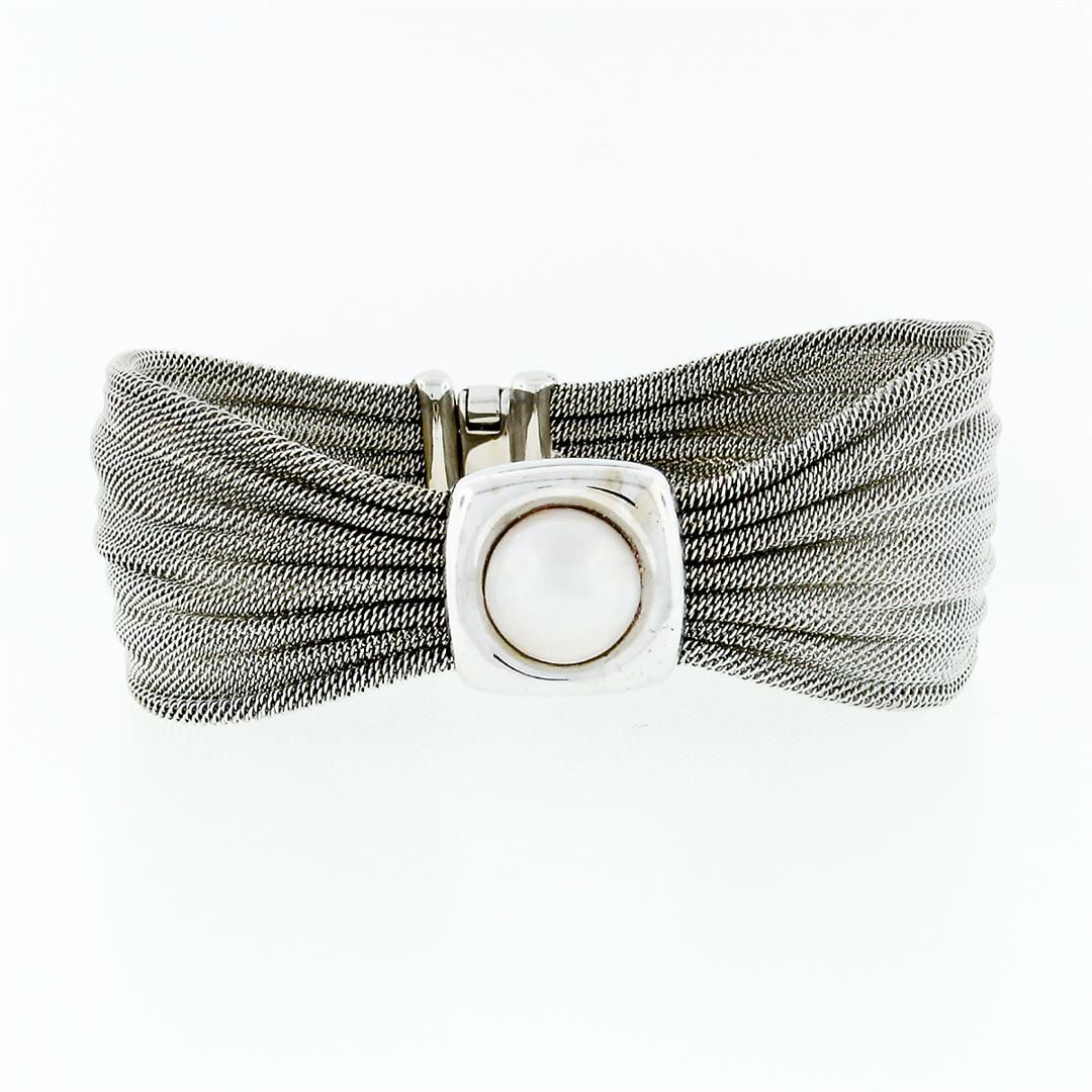 A solid 18k white gold scrunched mesh bracelet with 1 round top mabe pearl (10mm). It weighs a total of 30.97 grams, measures 26mm wide, and measures 6.5 inches in length.