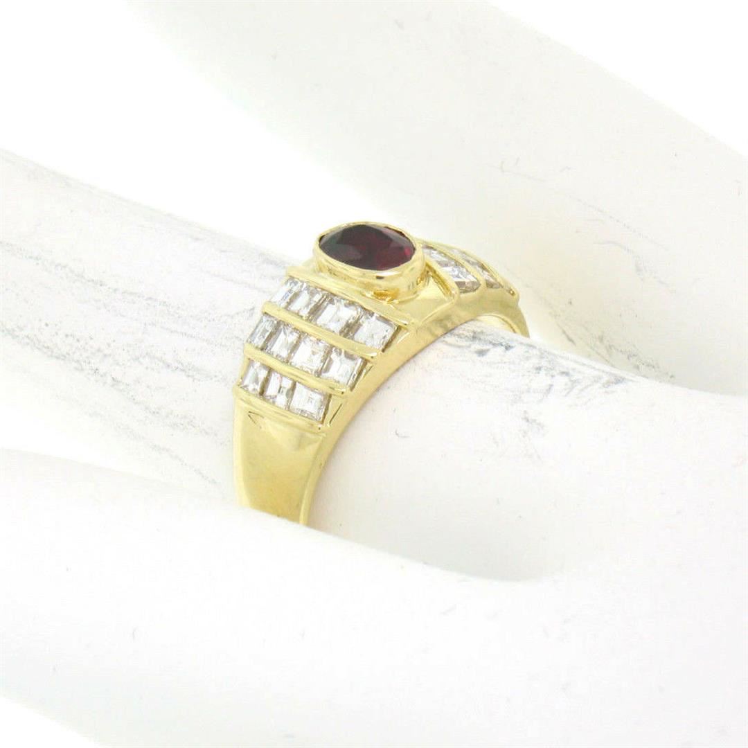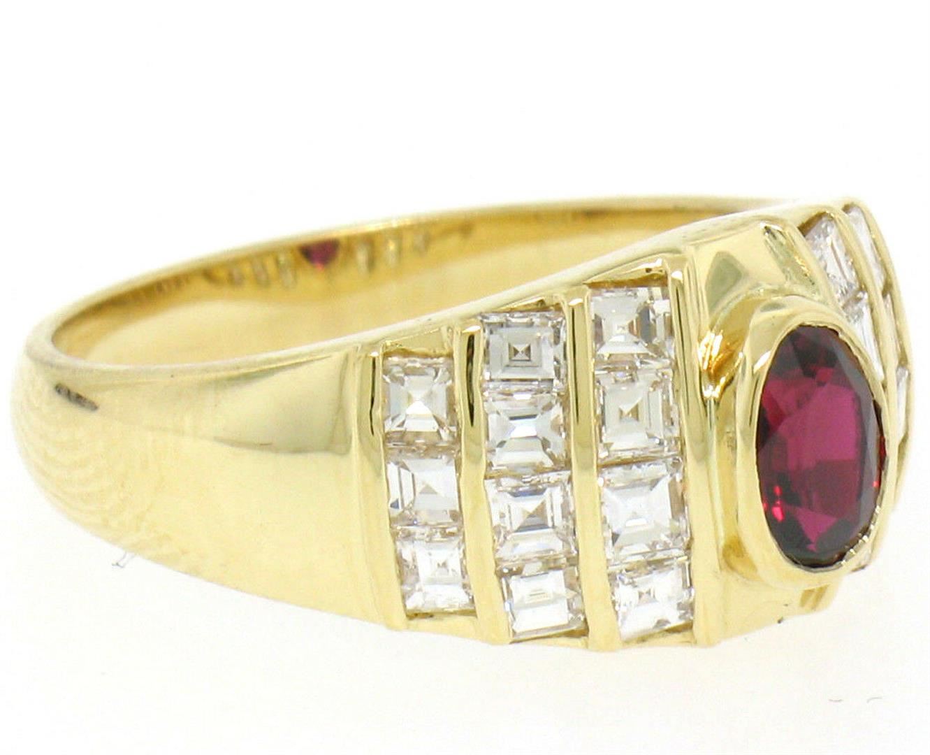 An 18k yellow gold wide band ring featuring a 0.75ct bezel set oval ruby accented by 1.00ctw of Asscher cut diamonds (D/E - VVS2). The ring is size 6.0, weighs a total of 5.80 grams, and measures 9.15mm wide.