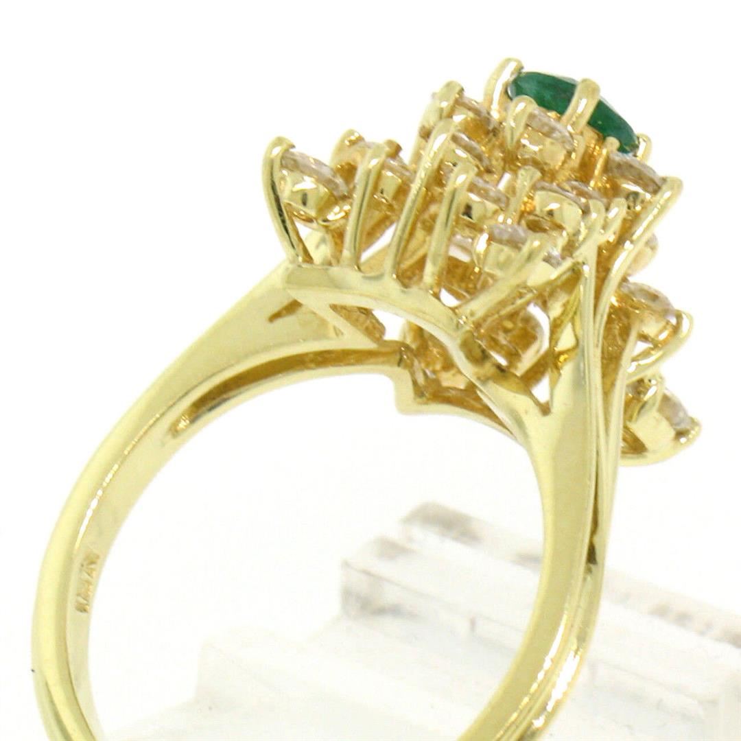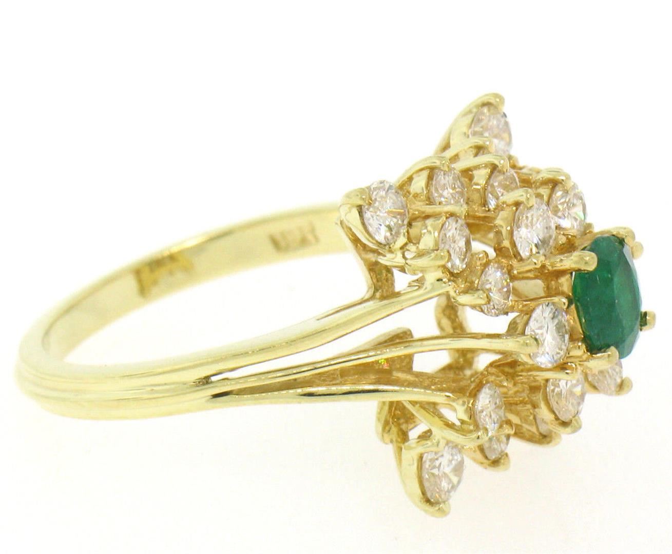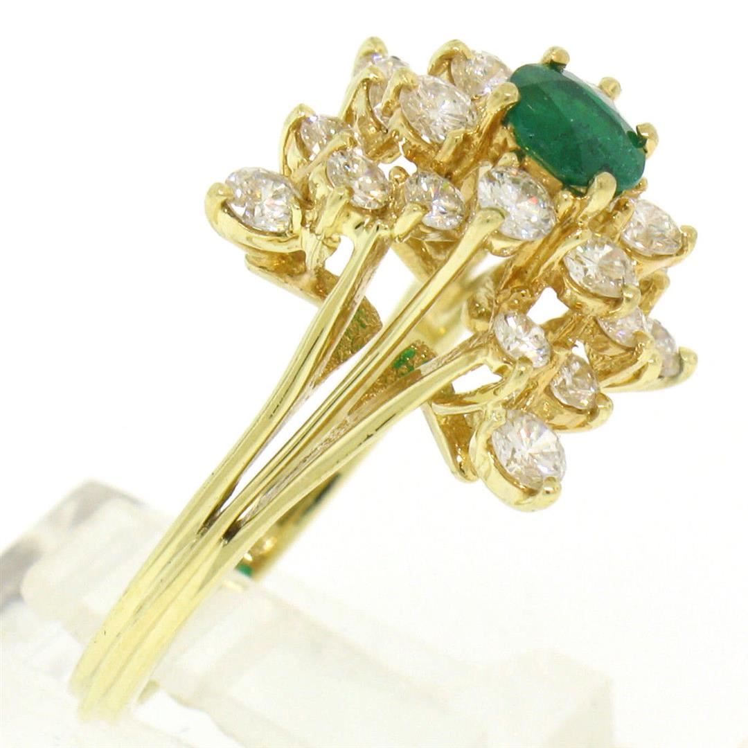 Estate 18k Yellow Gold 1.78ctw Oval Emerald & Round Diamond Pyramid Cluster Ring. Please see photos and description for all available information. An estate solid 18k yellow gold pyramid cluster Rring, Featuring 1 oval cut natural emerald (0.48ct), surrounded with a halo of 22 round brilliant cut natural diamonds (G/H- VS1; 1.30ctw). The ring is size 7.0, weighs a total of 5.7 grams, and measures 12.0mm wide.