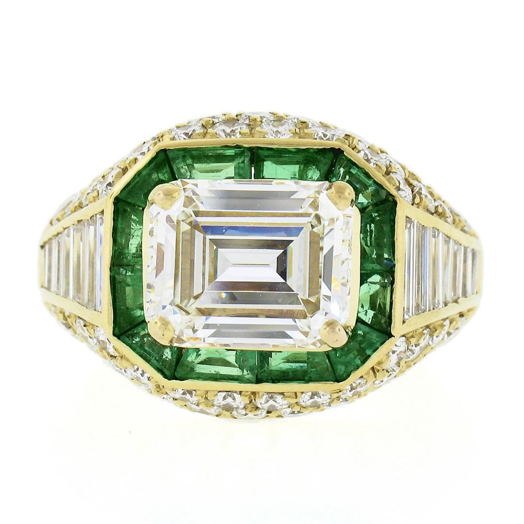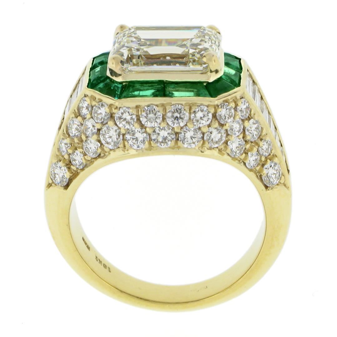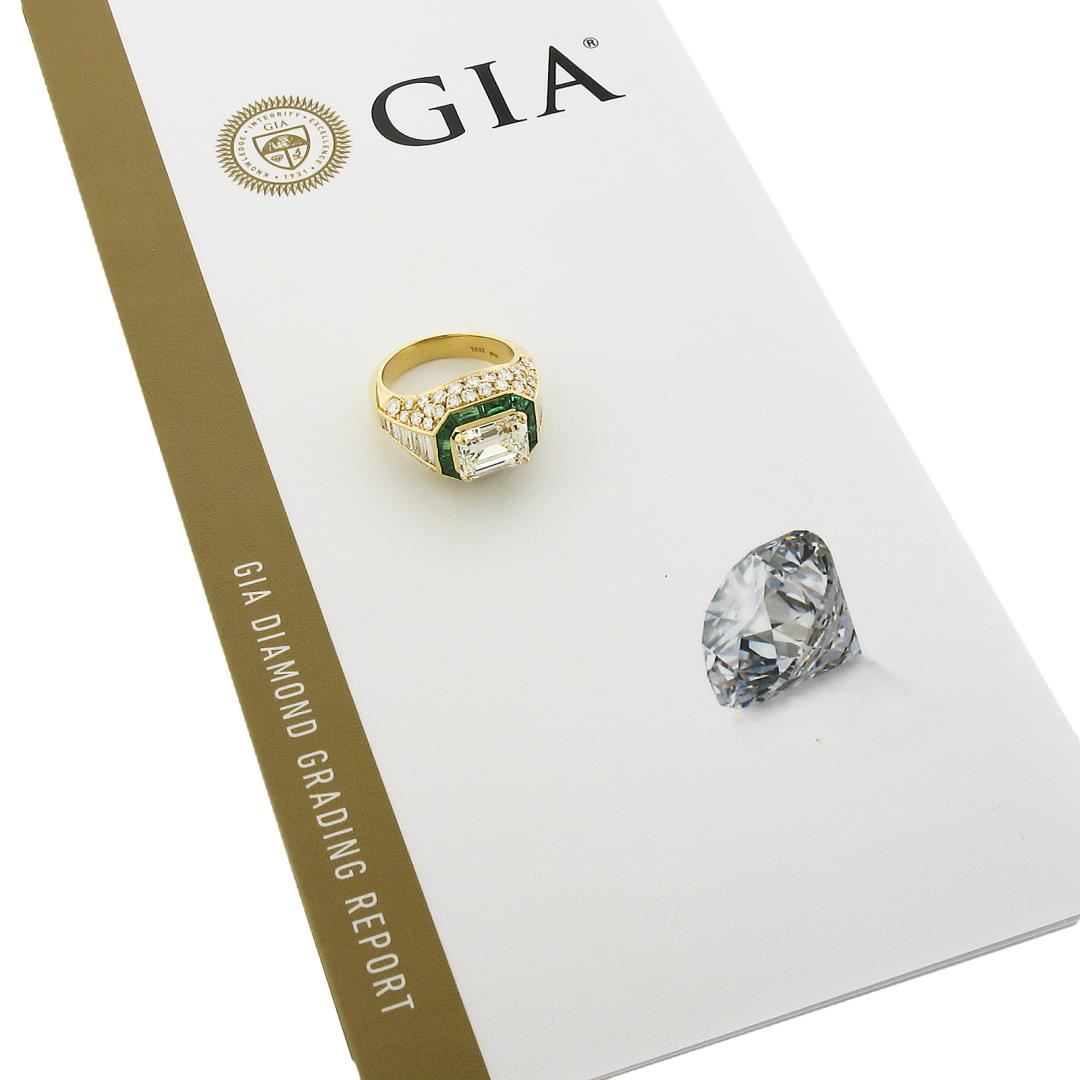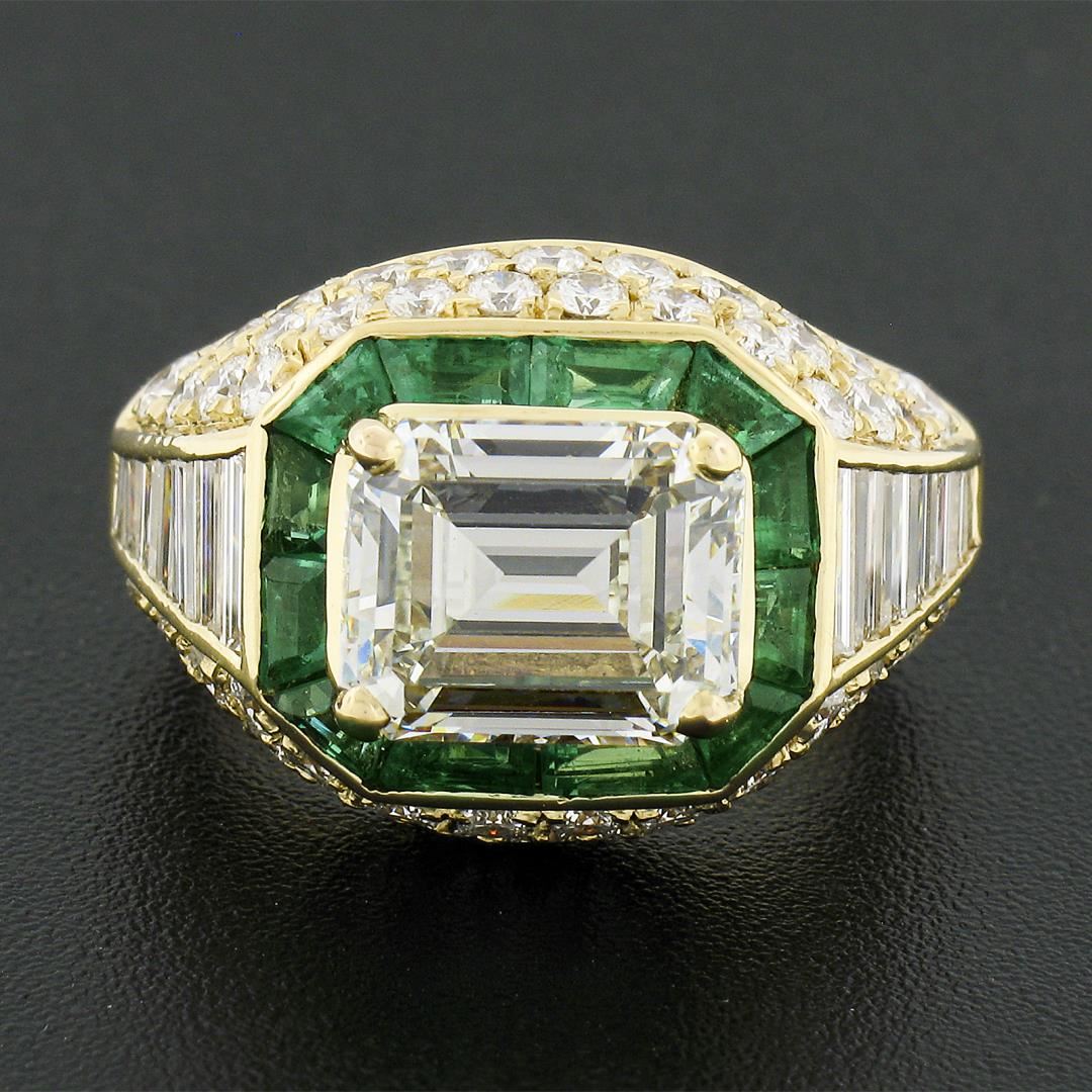 A solid 18k yellow gold ring, with 1 GIA graded emerald cut natural diamond ( J - VS1 ;3.03ct ), 50 round cut natural diamonds (F/G - VS1/VS2 ; 1.50ctw ), 14 graduated straight baguette cut natural diamonds (G/H - VS1/VS2 ; 0.84ctw), and 12 caliber cut natural emeralds (0.70ctw). The ring is size 6.5, weighs a total of 10.88 grams, and measures 14.6mm wide. Comes with all original relevant certifications.