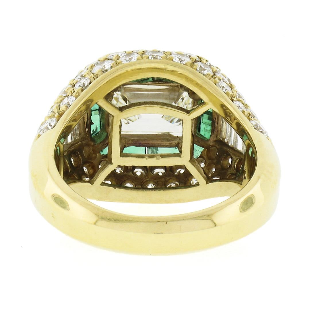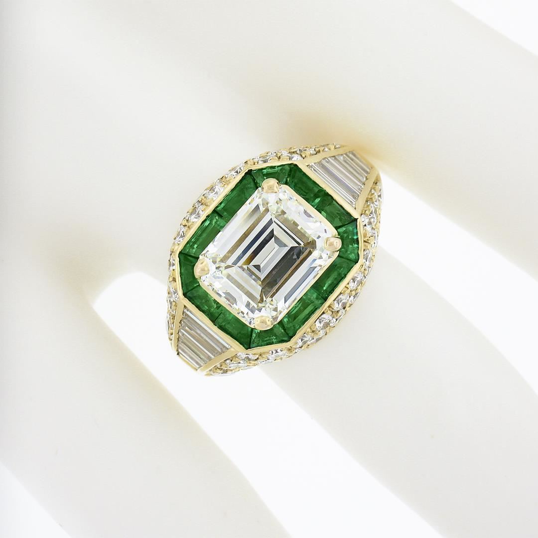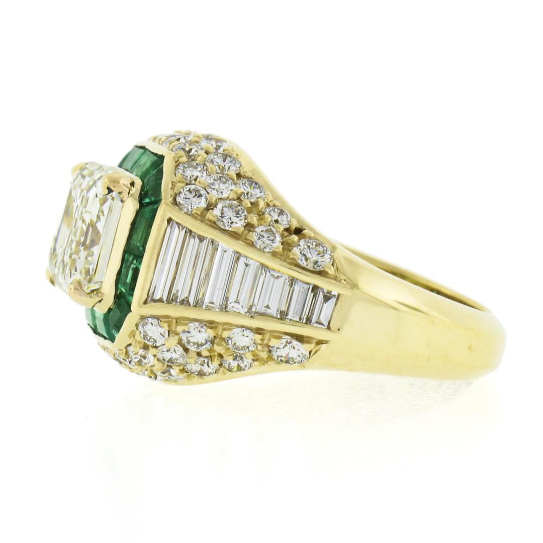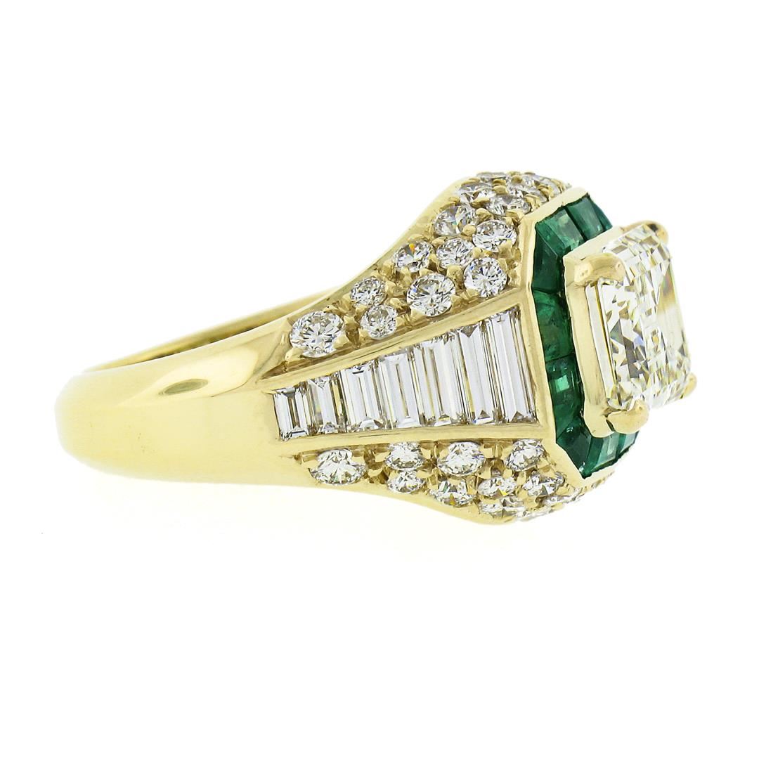 A solid 18k yellow gold ring, with 1 GIA graded emerald cut natural diamond ( J - VS1 ;3.03ct ), 50 round cut natural diamonds (F/G - VS1/VS2 ; 1.50ctw ), 14 graduated straight baguette cut natural diamonds (G/H - VS1/VS2 ; 0.84ctw), and 12 caliber cut natural emeralds (0.70ctw). The ring is size 6.5, weighs a total of 10.88 grams, and measures 14.6mm wide. Comes with all original relevant certifications.