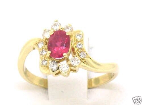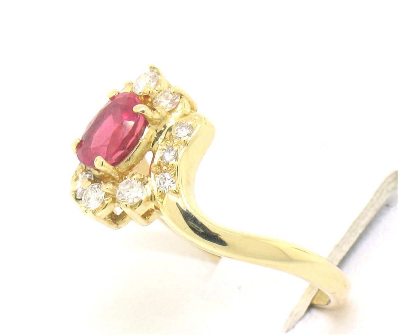 An estate solid 18k yellow gold solitaire ring, with 1 oval brilliant cut natural ruby (0.50ct), surrounded with a halo of 12 round brilliant cut natural diamonds (E/F- VVS2/VS1; 0.20ctw). The ring is size 6.0, weighs a total of 2.8 grams.