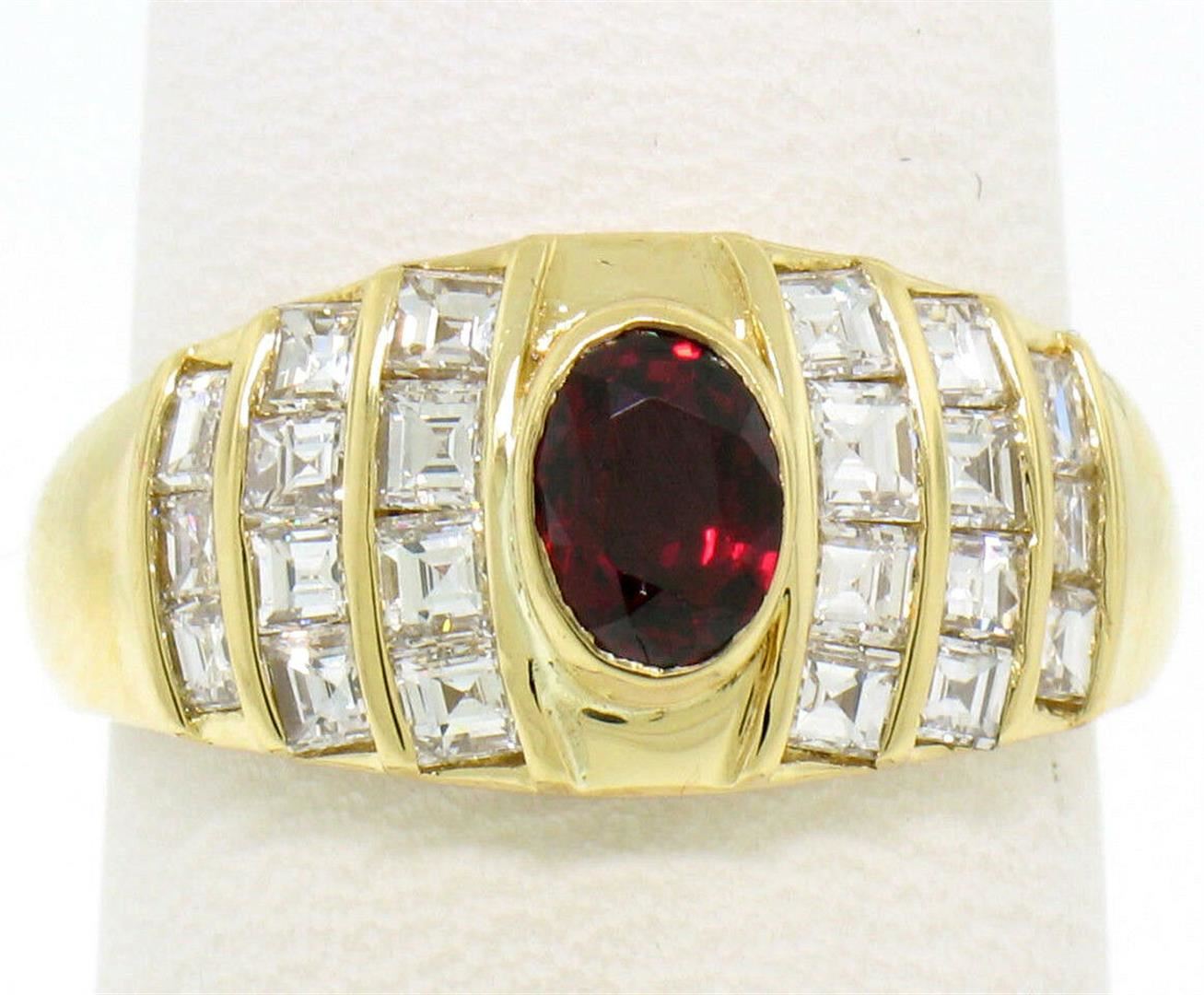 An 18kt yellow gold wide band ring featuring a 0.75ct bezel set oval ruby accented by 1.00ctw of Asscher cut diamonds (D/E - VVS2). The ring is size 6.0, weighs a total of 5.80 grams, and measures 9.15mm wide.