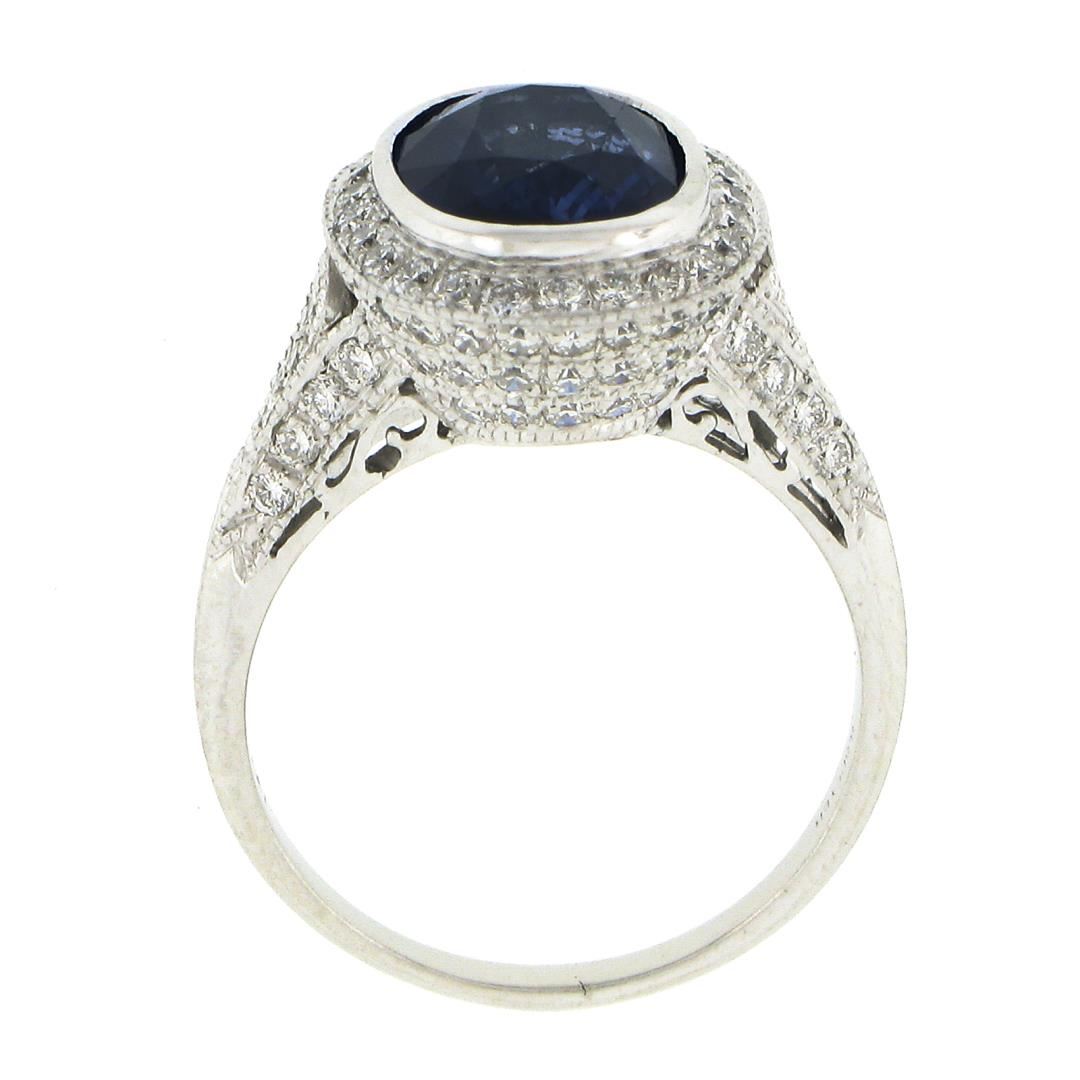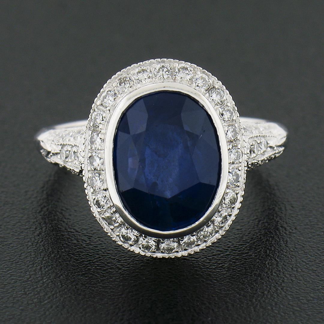 A solid platinum engagement ring, with 1 GIA graded oval cut natural sapphire (2.37ct), surrounded with a halo of 92 round cut natural diamonds (G/H - VS1/VS2 w/ a few SI1 ; 0.94ctw). The ring is size 5.0, weighs a total of 5.71 grams, and measures 13.8mm wide. Comes with all original relevant certifications.