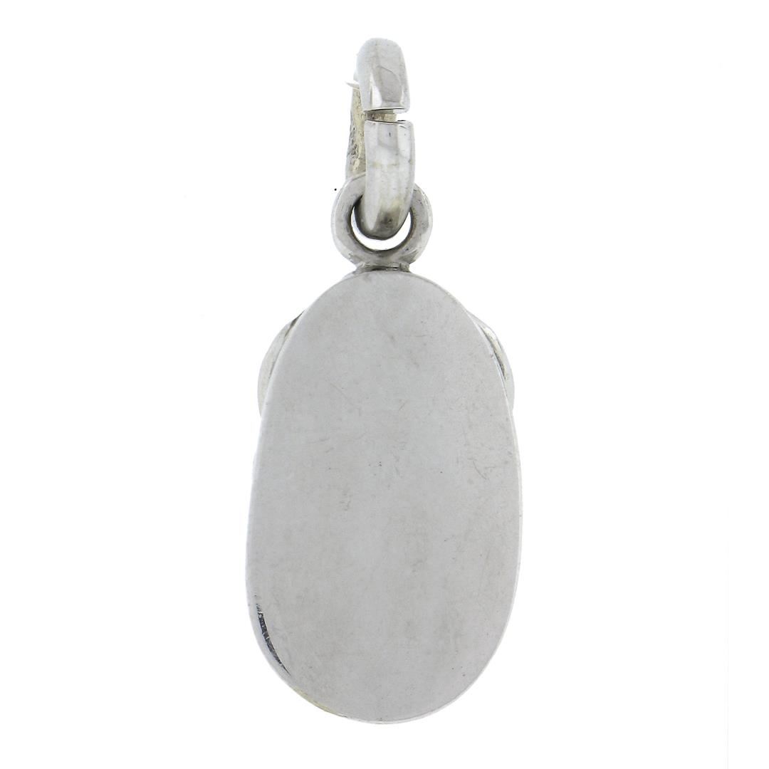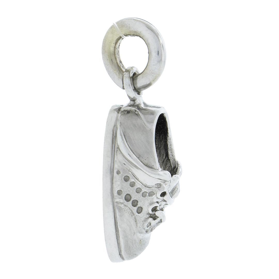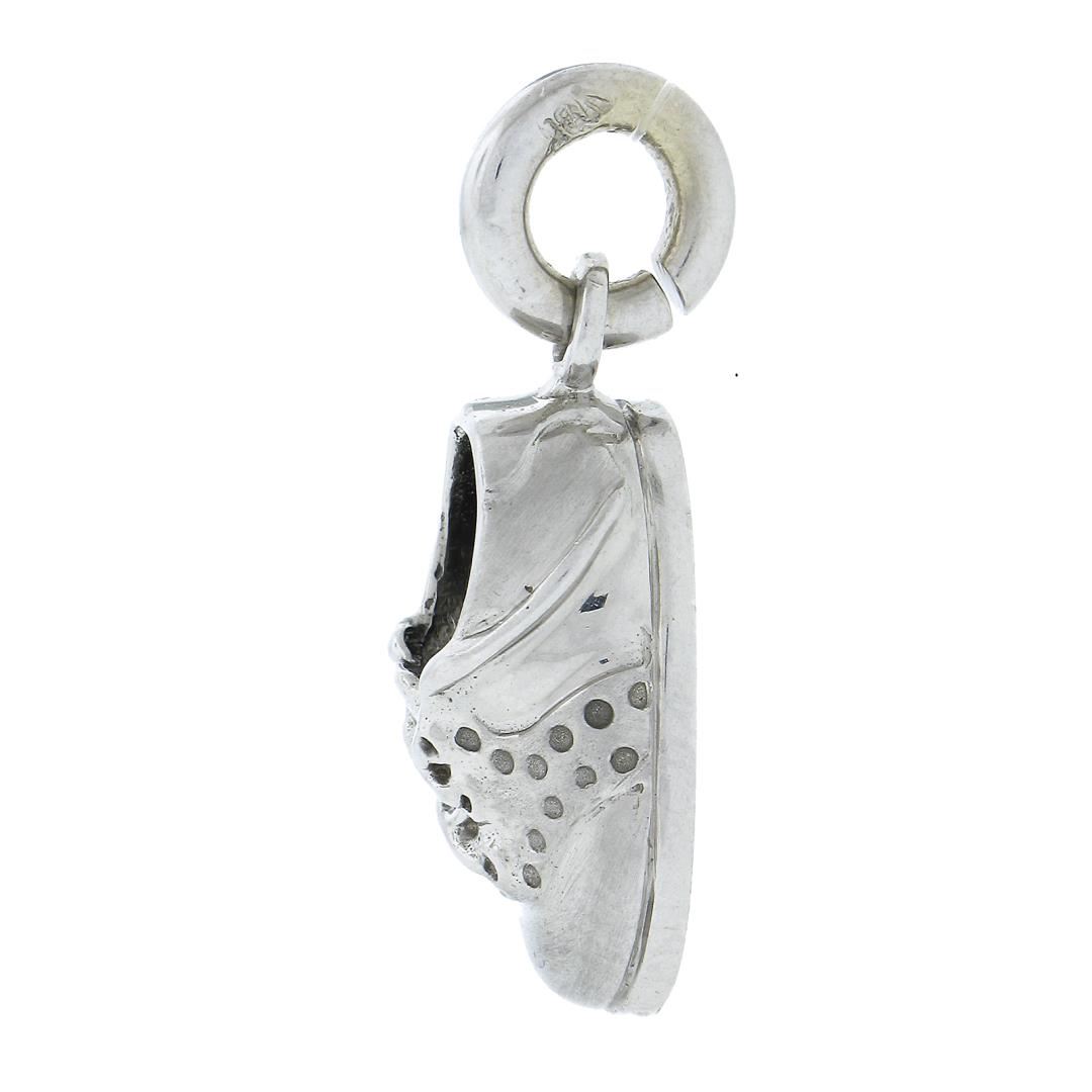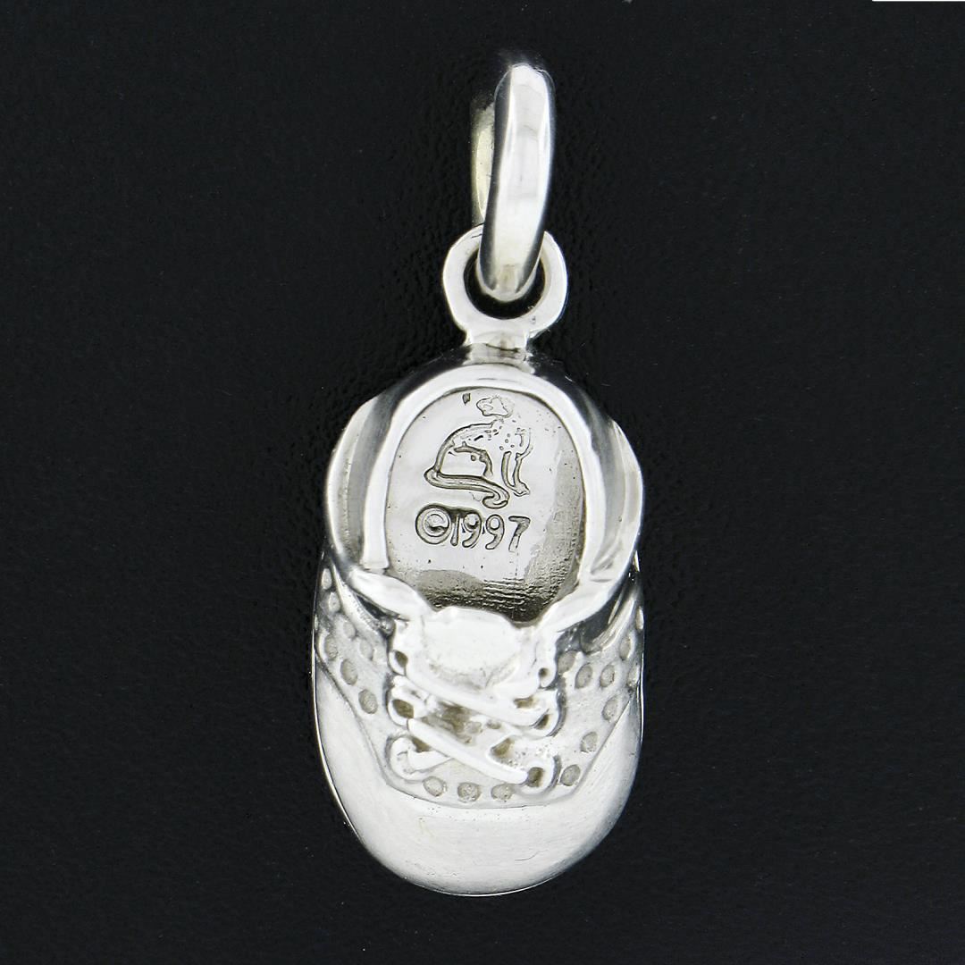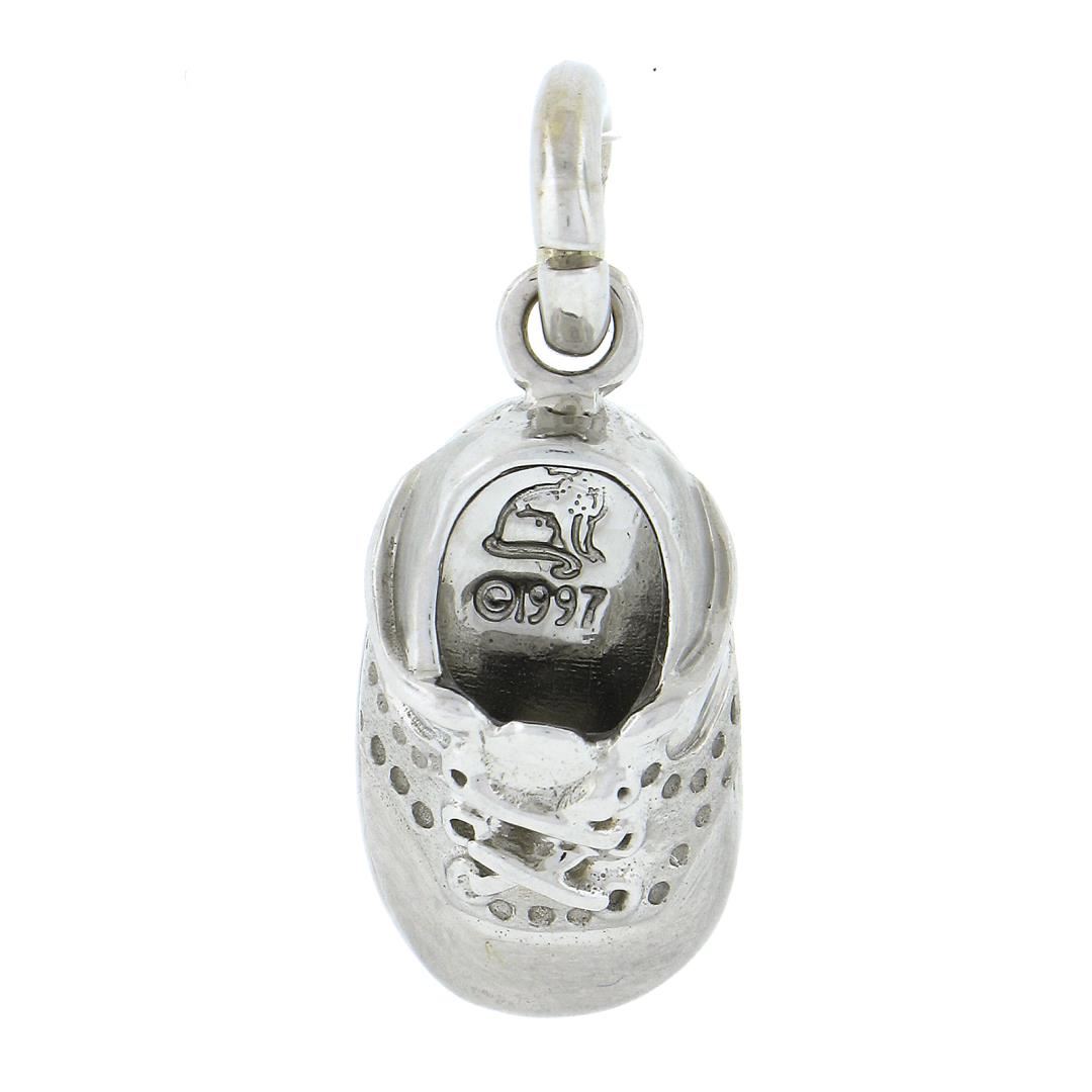 A solid 18k white gold lucky baby shoe charm pendant. The pendant weighs a total of 6.85 grams, measures 26.4x10.9mm including the bail, and the inside of the bail measures 3.1mm.