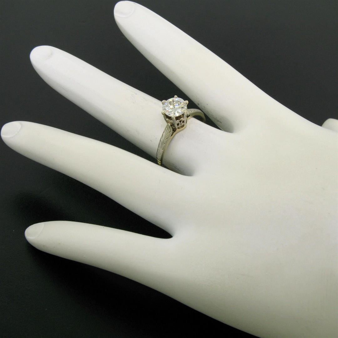 One Antique Etched 14k Two Tone Gold 0.80ct European Cut Diamond Solitaire Engagement Ring. Item Details: Material: Solid 14K Yellow and White Gold, Weight: 1.9 Grams, Stone(s): (1) Natural Genuine Diamond - Round European Cut - Prong Set - E Color - VS1 Clarity, Total Carat Weight: 0.80ct (Exact), Ring Size: 6.75 (We can custom size this ring.), Ring Width: 7.45mm, Ring Height: 7.98mm rise off the finger, Condition: Antique engagement ring w/ original finish. Excellent, ready to wear condition!