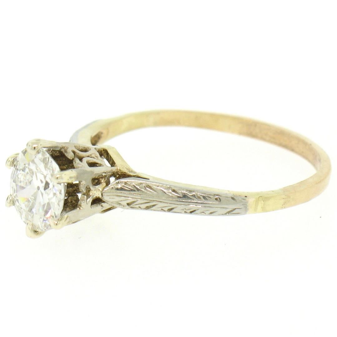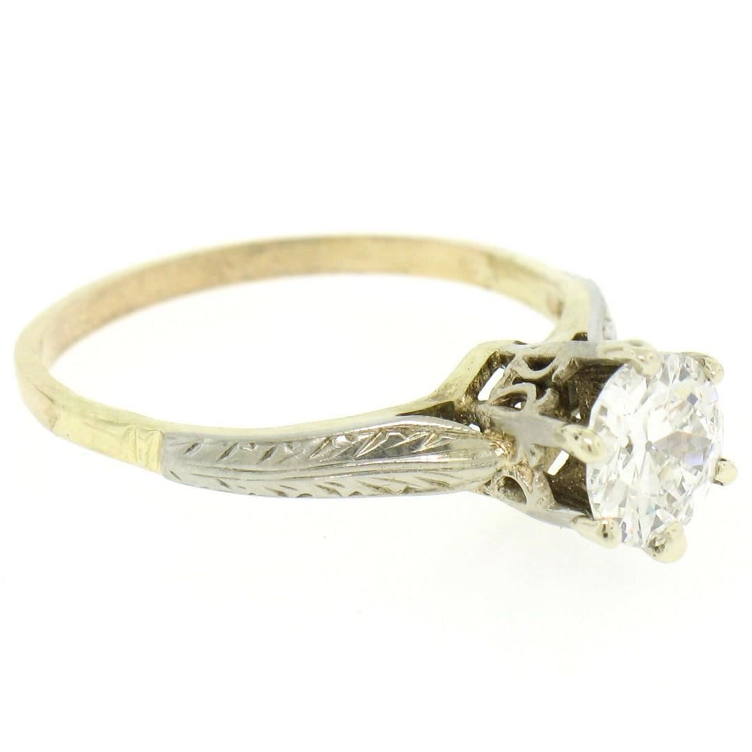 One Antique Etched 14k Two Tone Gold 0.80ct European Cut Diamond Solitaire Engagement Ring. Item Details: Material: Solid 14K Yellow and White Gold, Weight: 1.9 Grams, Stone(s): (1) Natural Genuine Diamond - Round European Cut - Prong Set - E Color - VS1 Clarity, Total Carat Weight: 0.80ct (Exact), Ring Size: 6.75 (We can custom size this ring.), Ring Width: 7.45mm, Ring Height: 7.98mm rise off the finger, Condition: Antique engagement ring w/ original finish. Excellent, ready to wear condition!