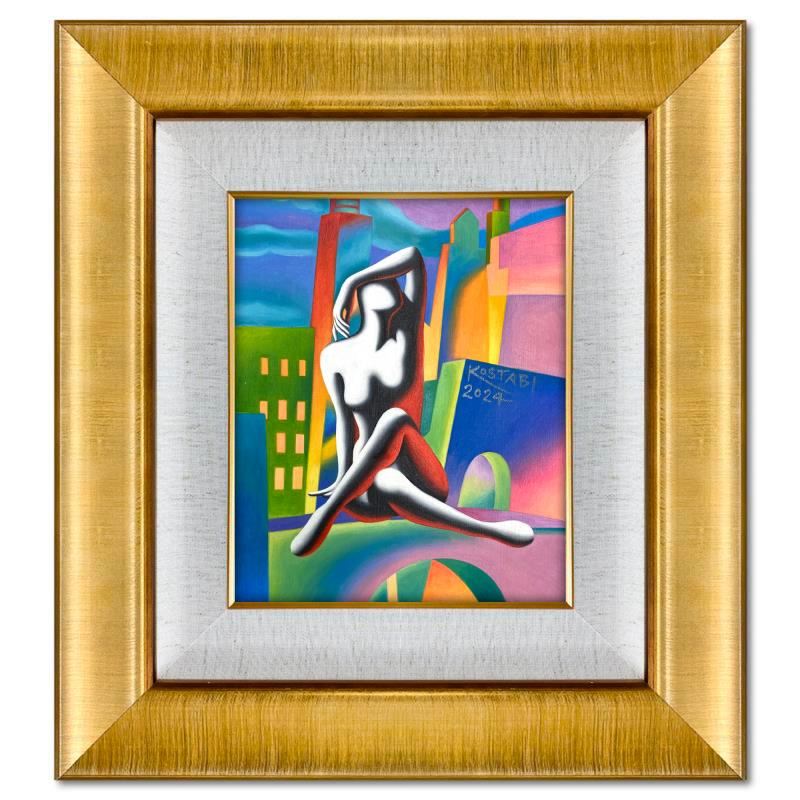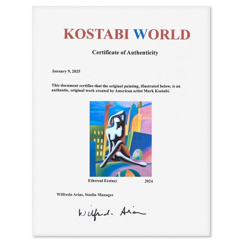 "Etheral Ecstasy"is an original oil painting on canvas by Mark Kostabi, hand signed by the artist. This piece comes custom framed. Includes Certificate of Authenticity. Measures approx. 22.5" x 20.5" (frame), 12.5" x 10.5" (image). This item requires special handling and may have a longer than usual turnaround.