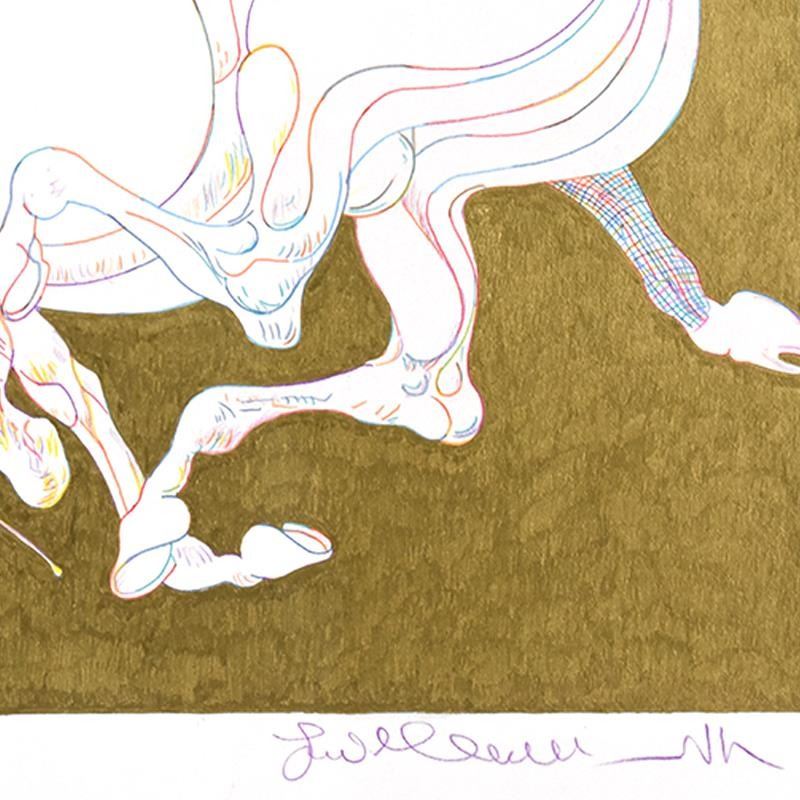 "Etude Pour Eldorado" is an original hand colored drawing on paper with hand laid gold leaf by Guillaume Azoulay, hand signed by the artist. This piece comes custom framed. Includes Letter of Authenticity. Measures approx. 28" x 23" (frame); 17" x 12" (image).