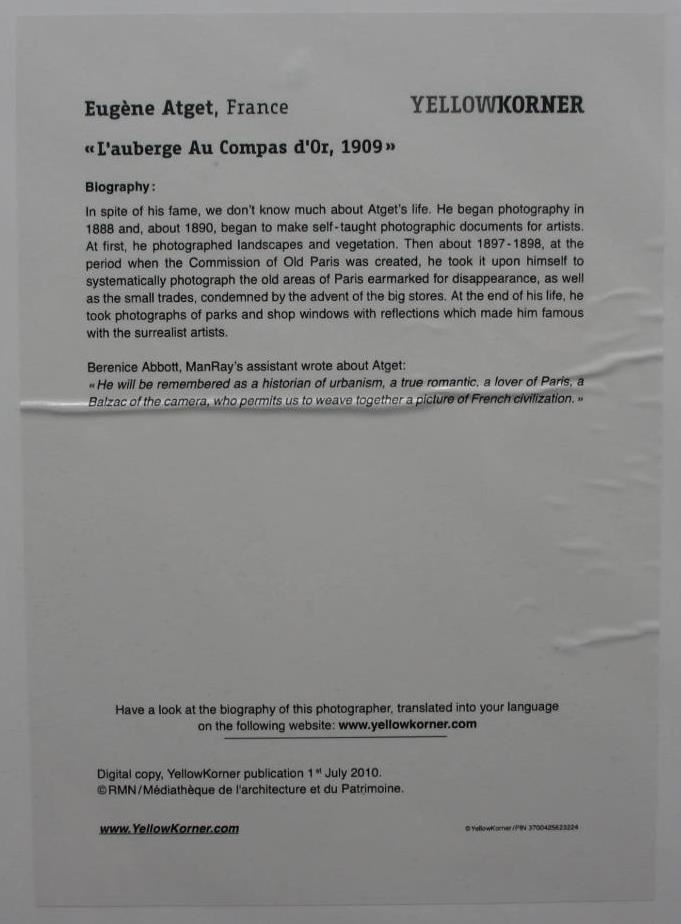 L'auberge Au Compas d'Or, 1909 Certified Photograph, Eugene Atget YellowKorner Certified Photograph. Certificate of Authenticity from YellowKorner affixed to the back. Matted Dimensions 16"x20". Protected with Clear Mylar Sleeve.