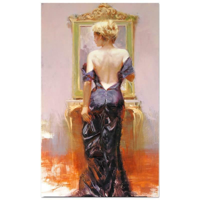 "Evening Elegance" is a hand embellished limited edition giclee on canvas by Pino (1939-2010), numbered and hand signed. Includes Certificate of Authenticity. Measures approx. 24" x 40" (image). This piece is not stretched.