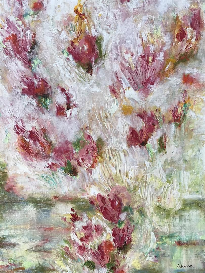 An original Acrylic on stretched canvas by Adonna 16 x 20. Abstract of florals rising from calm waters