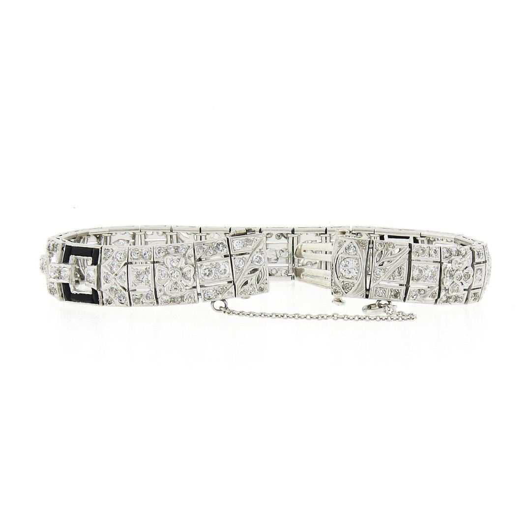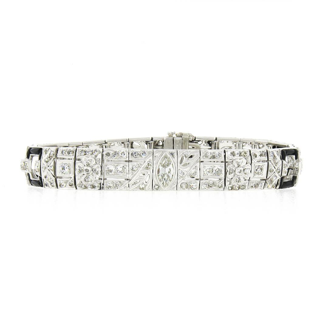 An antique solid platinum line bracelet, with 1 old marquise cut natural diamond (H/I Color - SI1 Clarity - 0.58ctw), 182 old european & old single cut natural diamonds (G/I - VS1/SI2 ; 5.45ctw), and 24 french baguette cut natrual black onyx. It weighs a total of 35.30 grams, measures 10.9mm wide, and measures 6.75 inches in length.