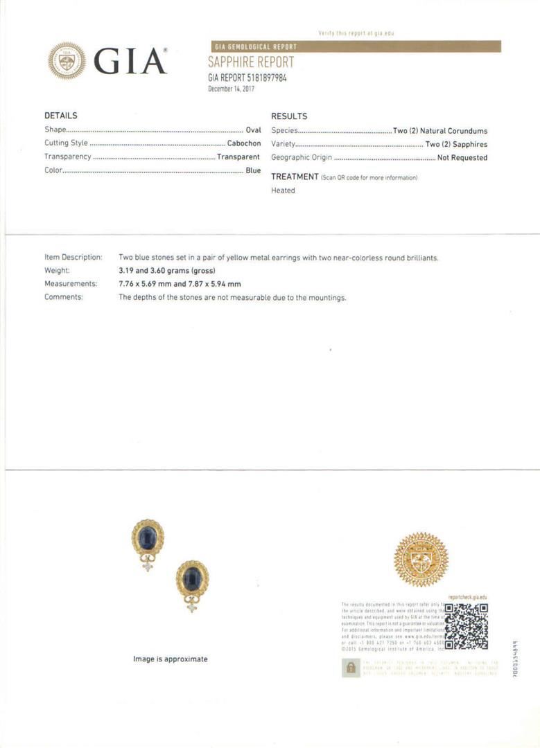 A vintage solid 18k yellow gold stud earrings, featuring 2 Gia certified oval cut natural sapphires (3.20ctw ), and 2 round brilliant cut natural diamonds (F- VS1 ; 0.10ctw ). The earrings measure approximately 17.80x11.20mm and weigh a total of 6.80 grams. Comes with all original relevant certifications.