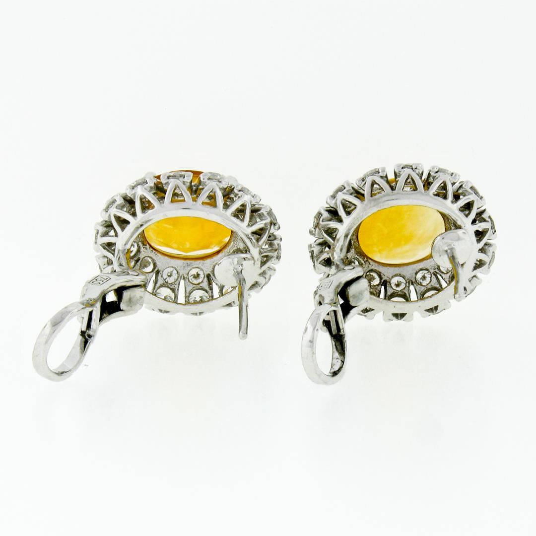 A solid 18k white gold omega earrings, with 2 oval cut natural citrines (10x8mm - 5.00ctw ), surrounded with double halo of 56 round brilliant cut natural diamonds ( F/G - VVS2/VS1 ; 2.80ctw). The earrings measure approximately 15.8x14.2mm and weigh a total of 8.02 grams.